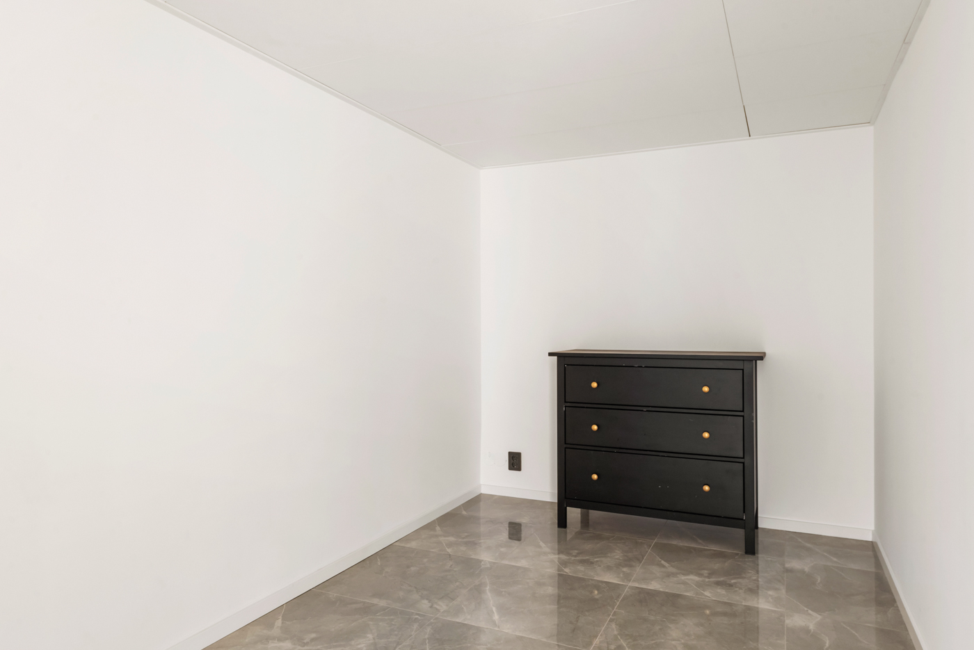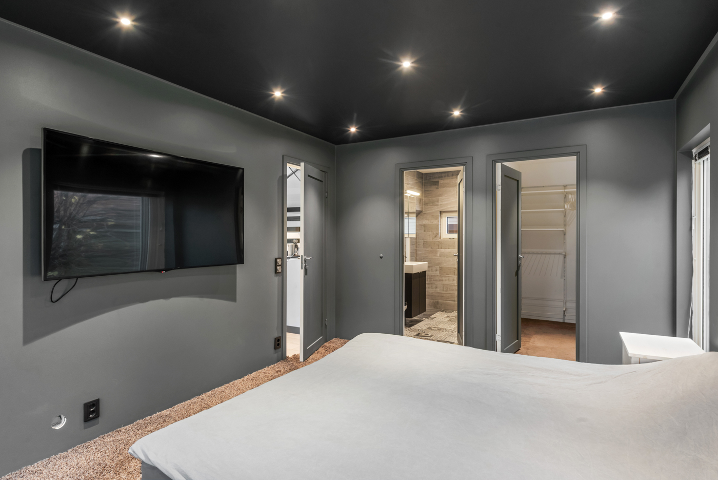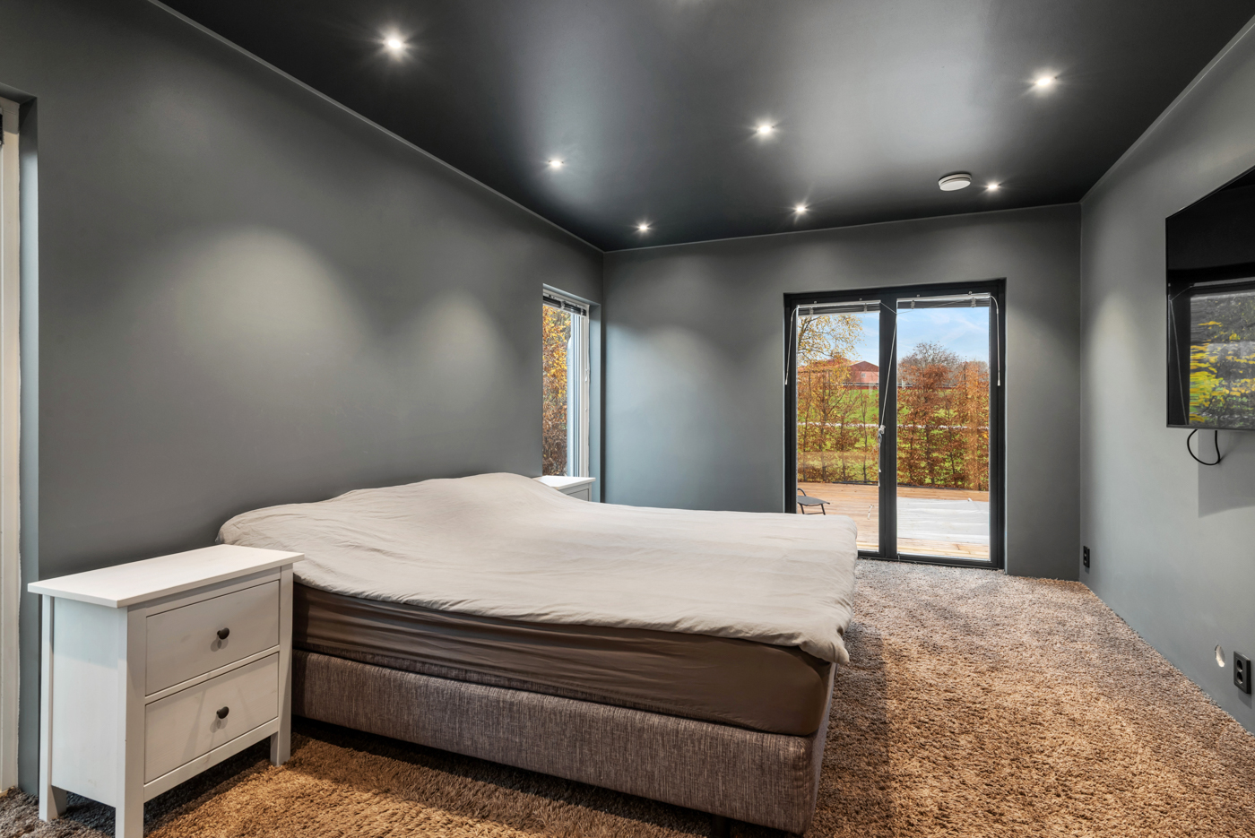 Rymligt sovrum med stora djupa fönster i två väderstreck. Sovrummet har en egen rymlig klädkammare samt toalett. I taket sitter spotlights, på golvet ligger ryamattor och väggarna är målade i en grå ton.