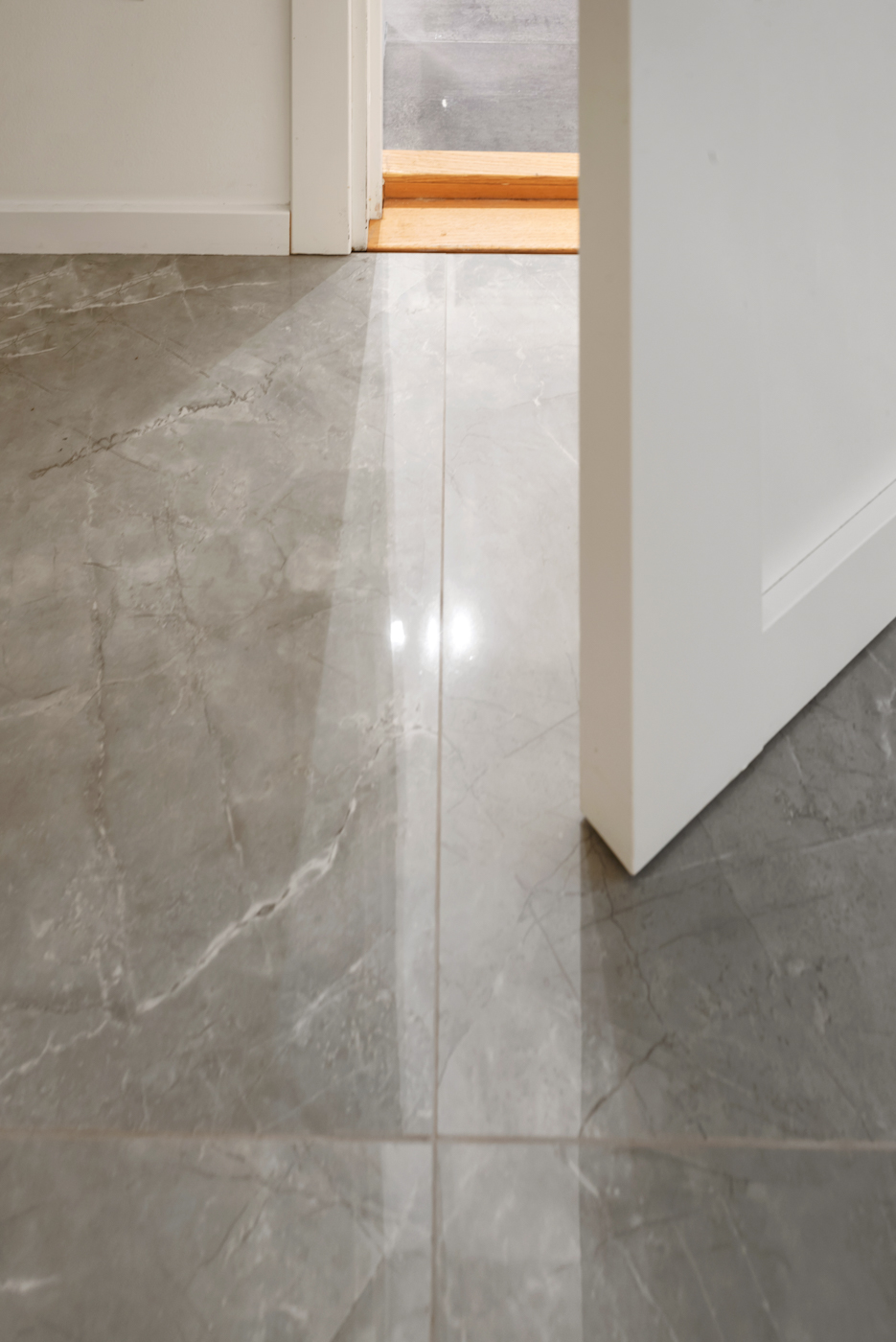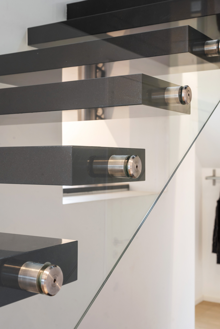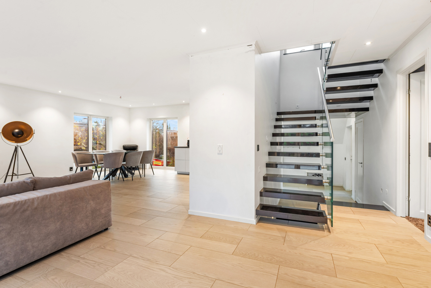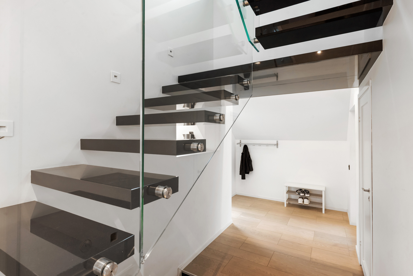 Ljus och trevlig inbjudande hall med klinkergolv, vitmålade väggar. Mitt i fastigheten smyckar en svävande trappa i granit med glasräcken upp till mellanplanet och övre våningen vilket ger ett härligt ljusinsläpp.