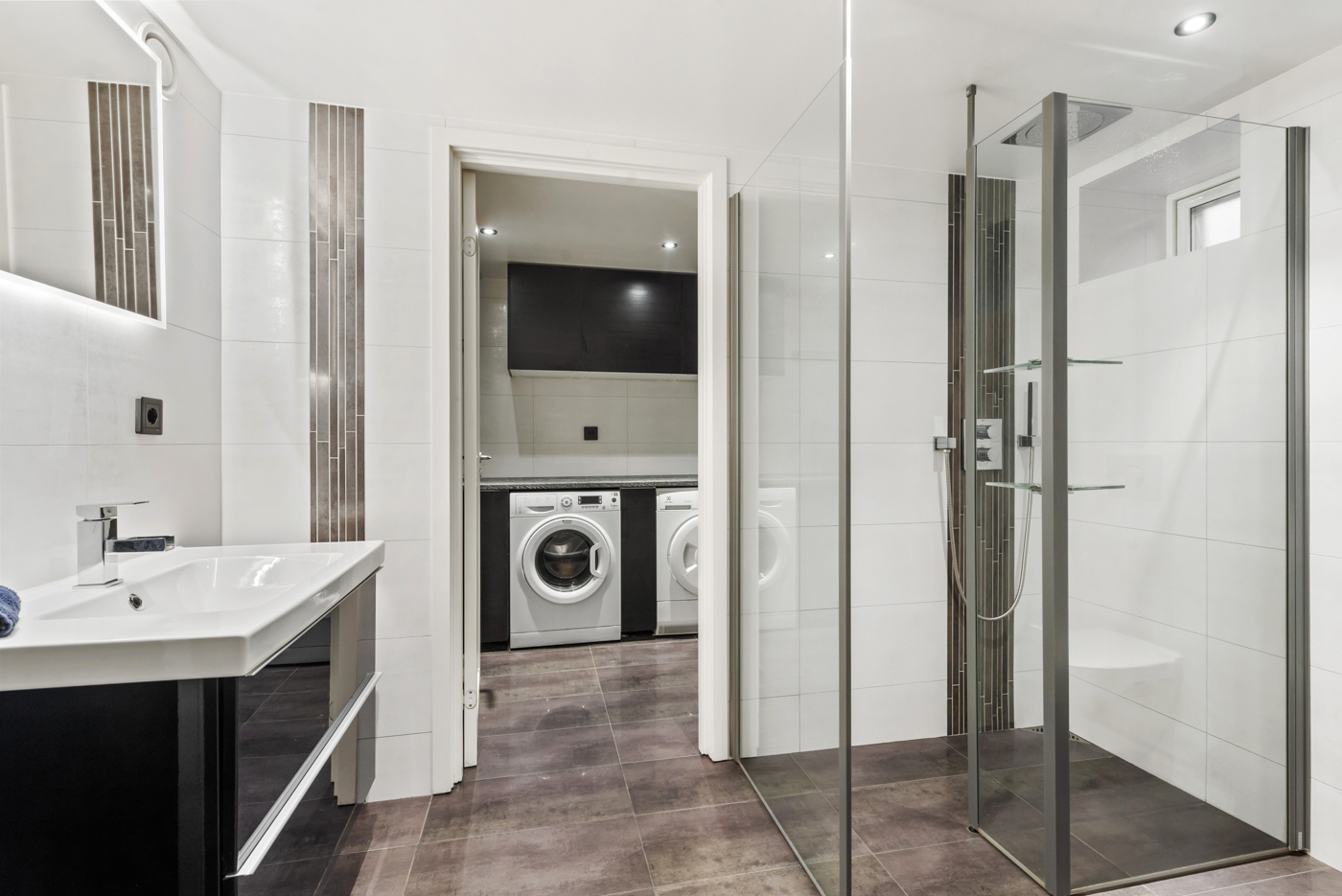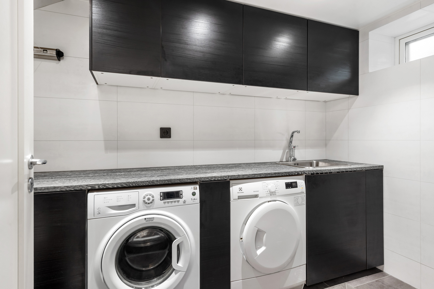 Mycket fräsch tvättstuga med över och underskåp (gott om förvaring). Lång arbetsbänk med tvättho. En hopvikbar strykbräda sitter på ena väggen samt klädlina för tvätten. Kakel och klinker. Tvättstugan sitter ihop med duschrummet som har en dusch med glasväggar, WC och bred handfatskommod med spegel ovan.