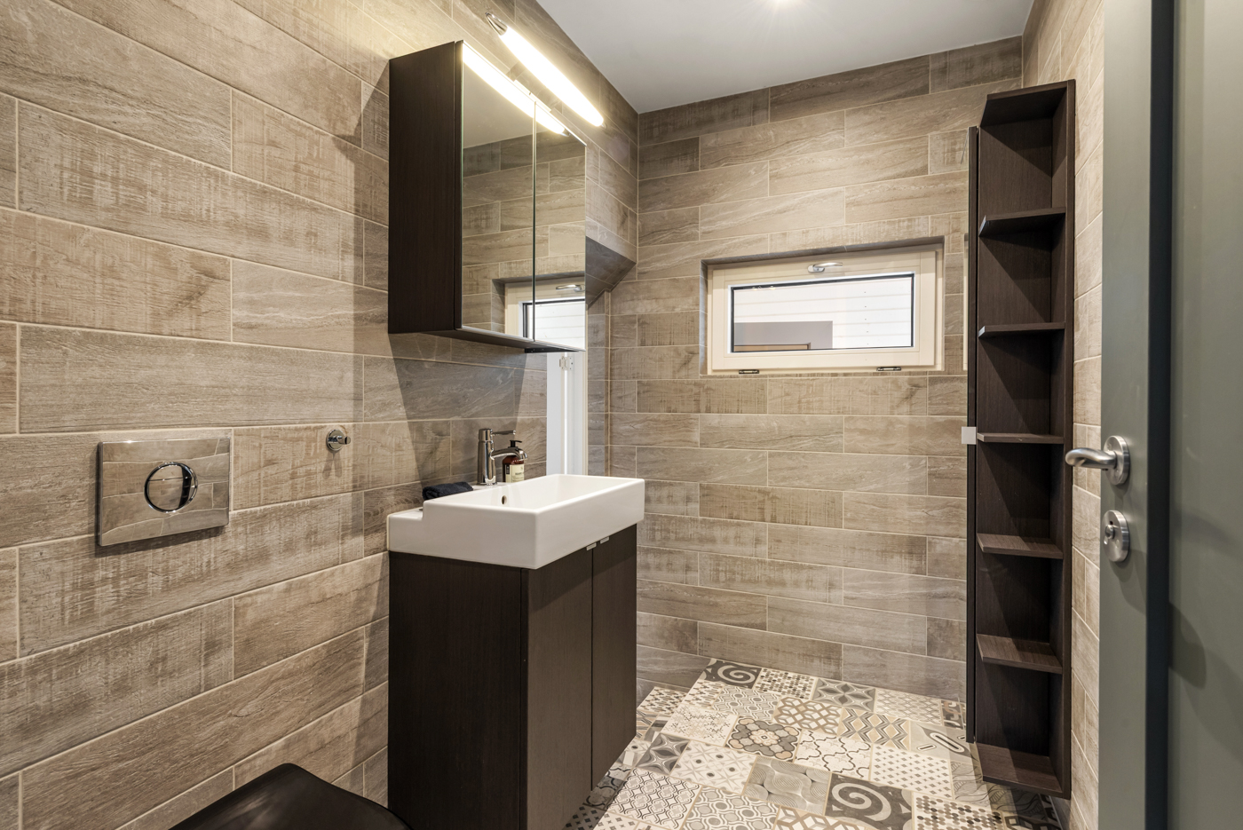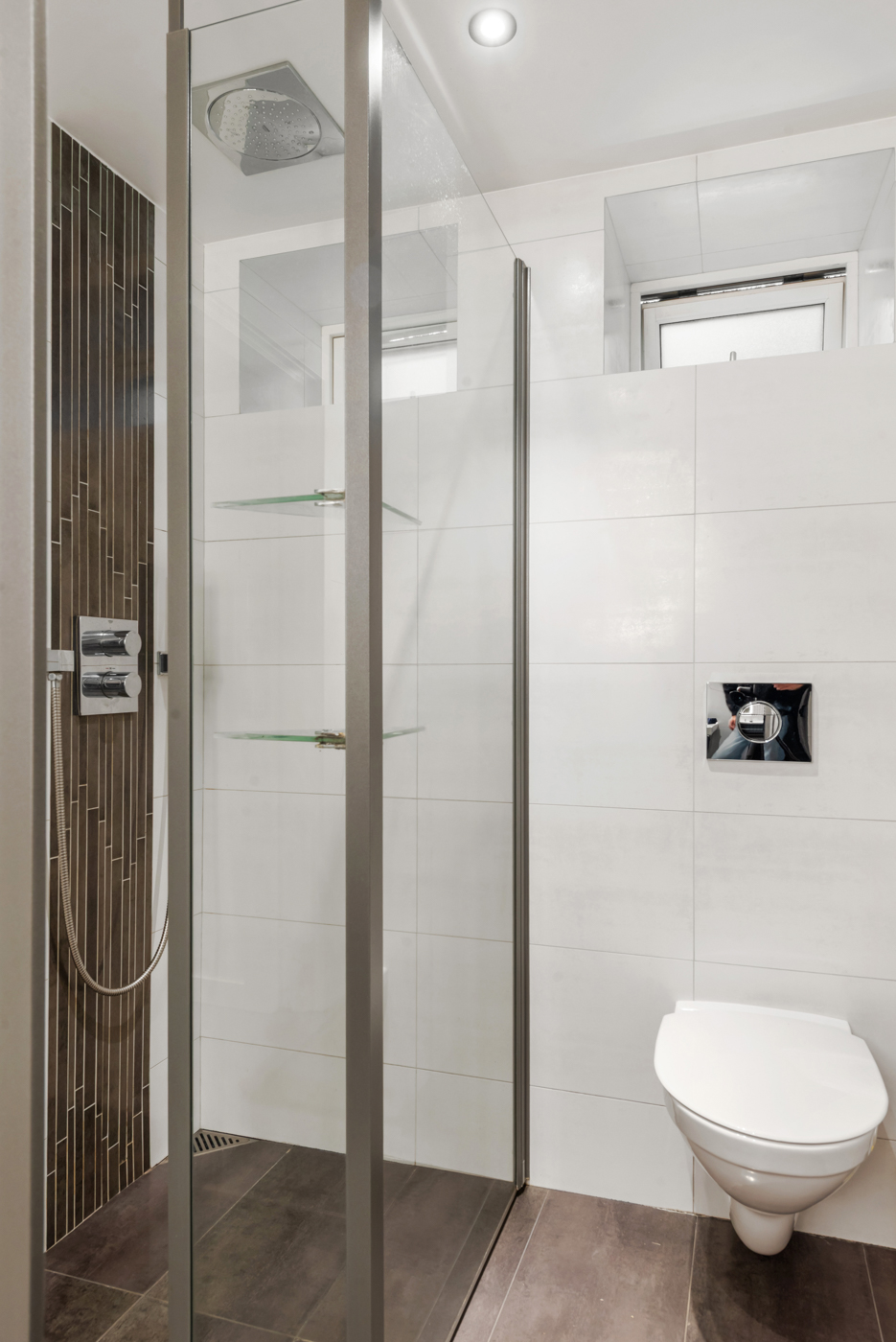 I anslutning till hallen och ena sovrummet nås en fin WC innehållandes vägghängd toalett, handfat med kommod, spegelskåp med belysning samt ett högskåp. Väggarna är kaklade, på golvet ligger ett snyggt klinkergolv. I taket sitter spotlights.