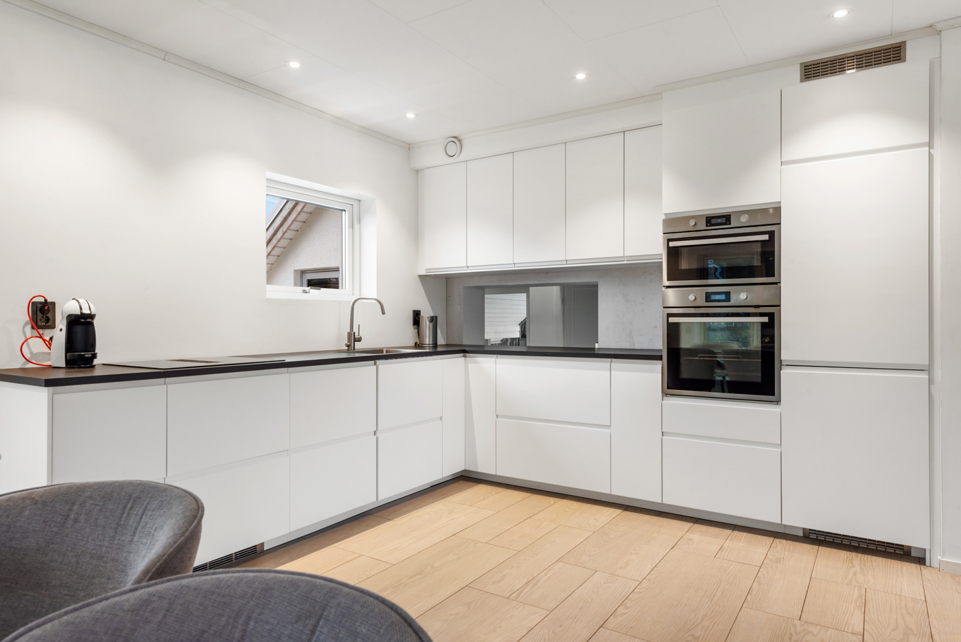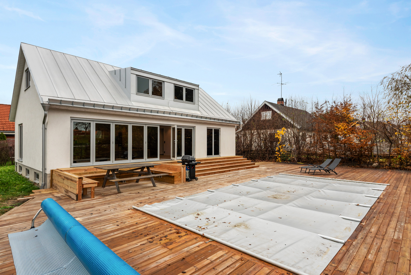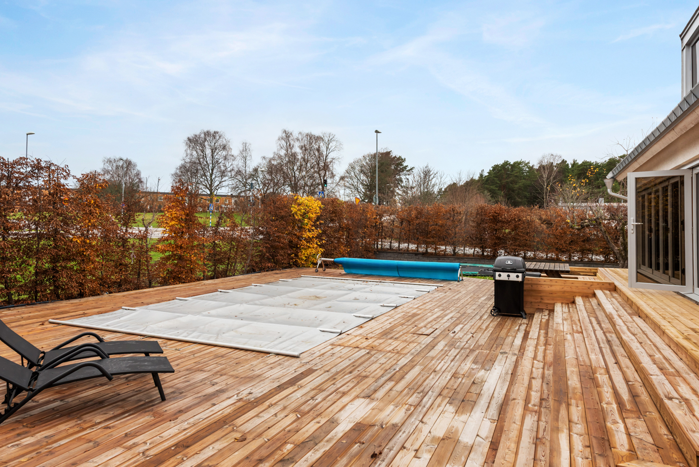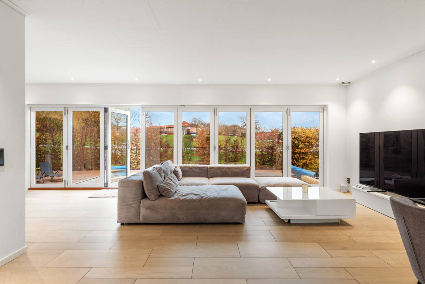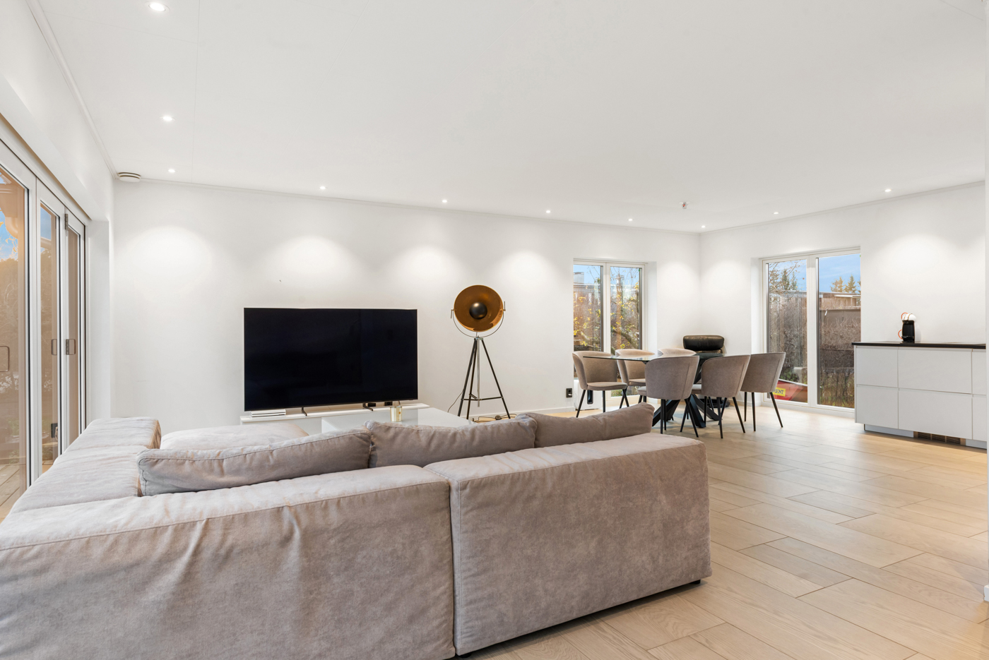 Öppen planlösning mellan köket och vardagsrummet. Kök från 2022 med full maskinell utrustning. Längs med hela den södra väggen är det skjutbara glasdörrar ut till pooldäcket. Mycket vackert golv med ljust målade väggar.