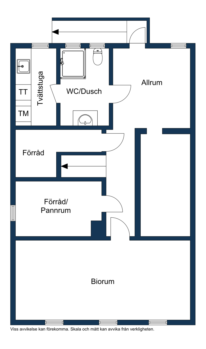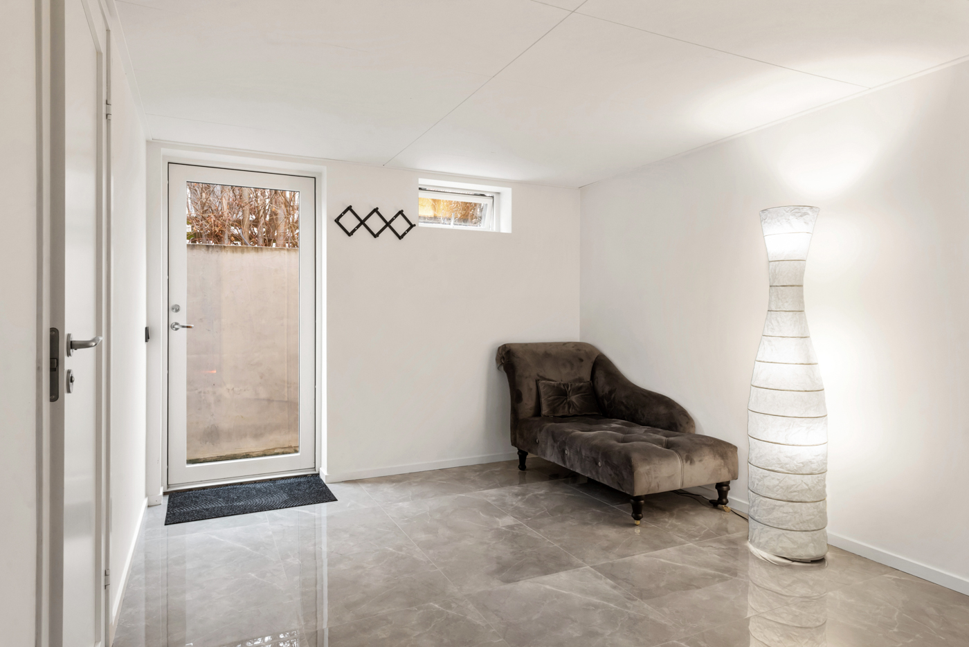 Allrum med klinkergolv och ljust målade väggar. Separat utgång från en dörr i helglas.