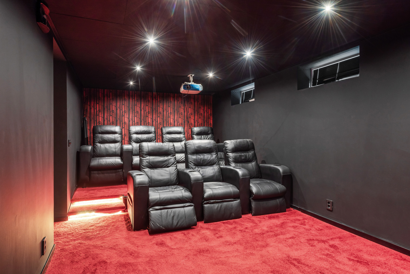 Biorum med sju fåtöljer. Röd heltäckande matta, svarta väggar med små spottar i taket. Förberett med flera elkopplingar för t.ex. mediasystem och ljud.