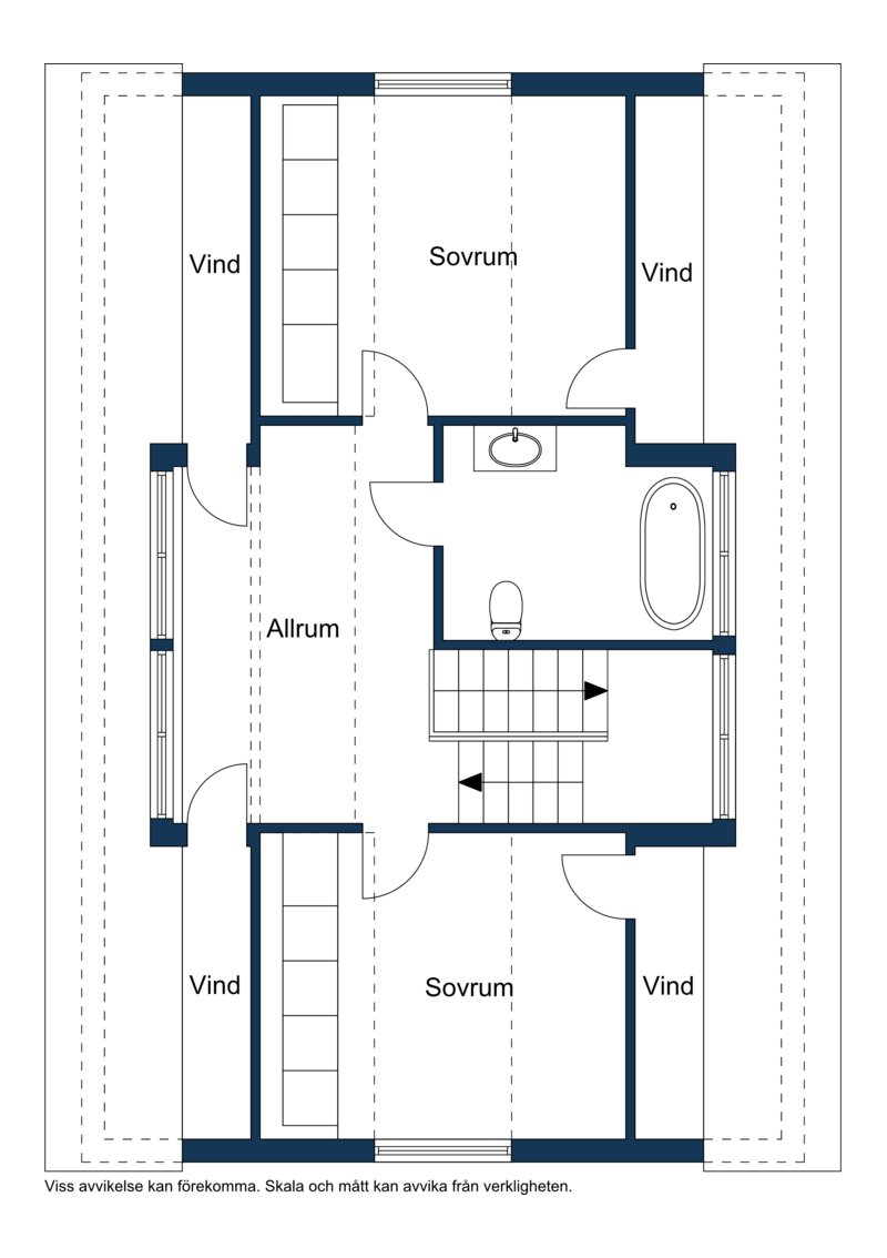 Utbyggda takkupor som gett ett allrum på övervåningen. Ljust målade väggar med fint trägolv.