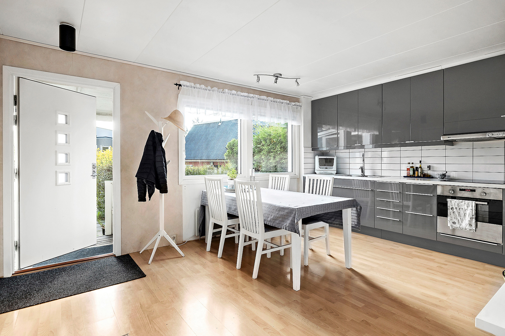 Rymlig hall via farstukvist med fönster. Ljus yta som är öppen mot köket. Här finns plats för skoställ och klädhängare mm. Tillgänglighet till bl.a. tvättstuga där mer förvaringsutrymme kan skapas. Ljusa tapeter på väggarna och trälaminat på golvet.