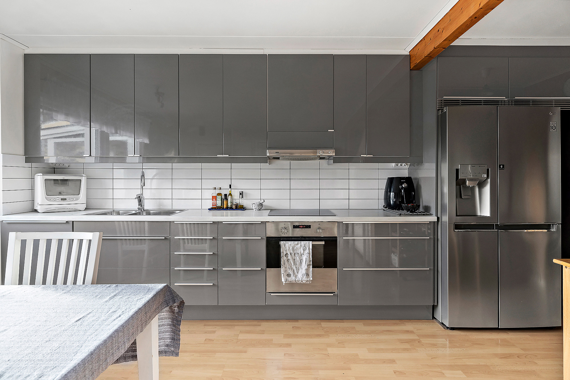 Stilrent Ikea-kök med flera skåp och lådor för förvaring. Integrerad diskmaskin, rostfri ugn, rostfri fläkt, induktionsspishäll, kyl och frys från 2022 med is- och vattenfunktion. Ljusa tapeter på väggarna och trälaminat på golvet. Litet förråd finns under trapp.