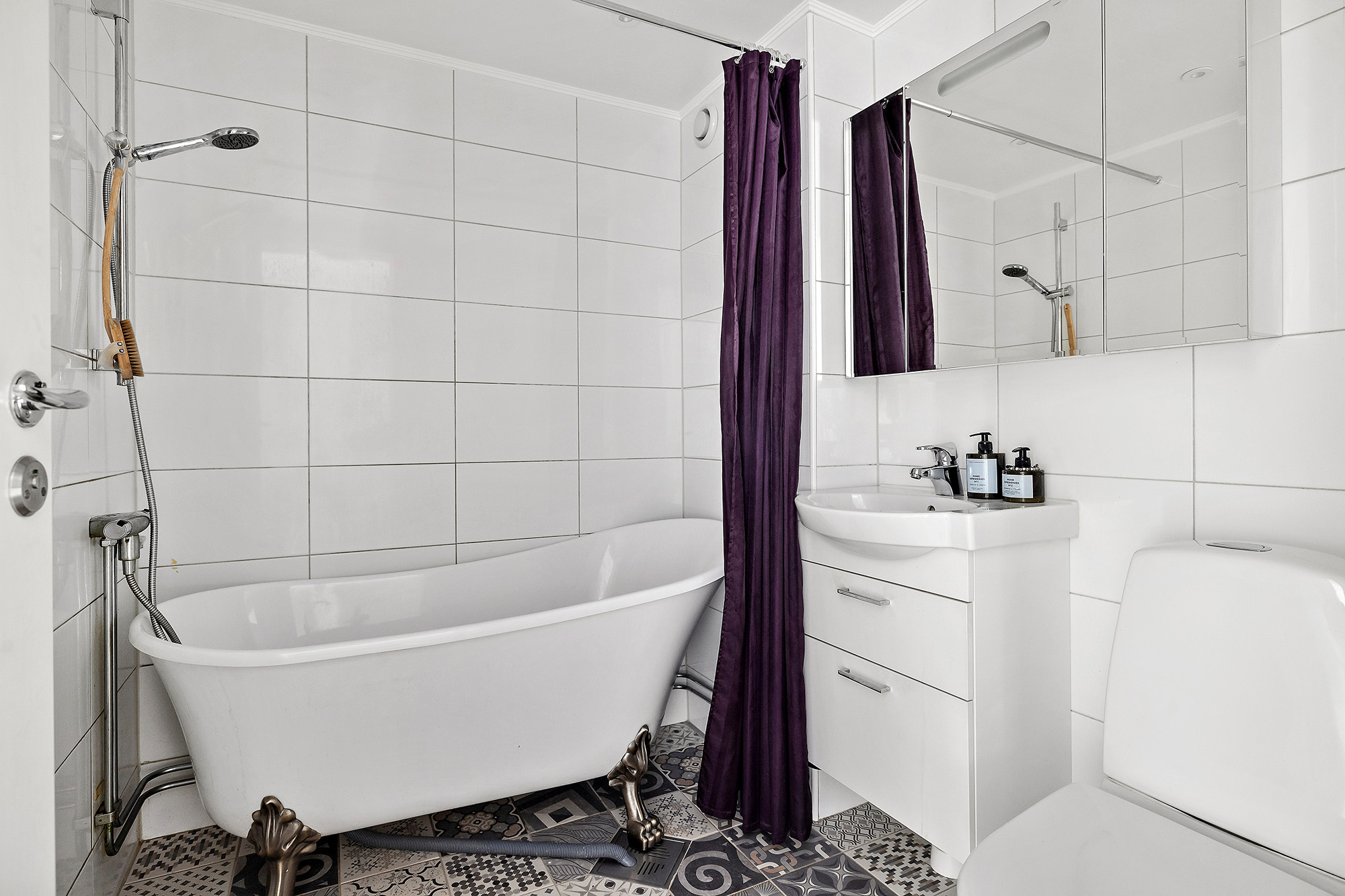 Även detta ett modernt och stilrent badrum. Detta med badkar på lejontassar. Brett spegelskåp med luckor som kan vinklas inåt. Uppvärmd handdukstork.