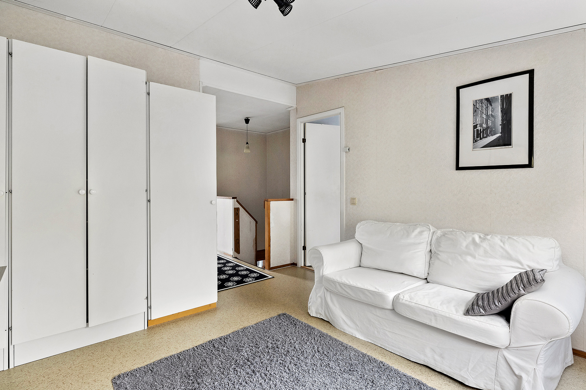 Målade väggar och matta på golvet. Här står en garderob.
