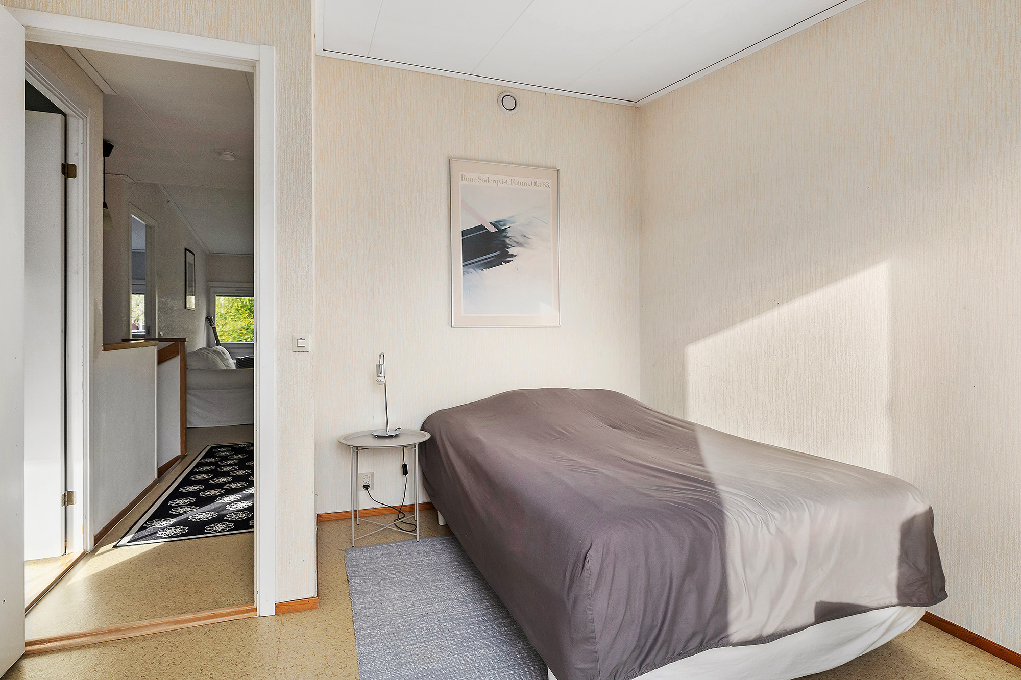 Allrum som även kan göras om till sovrum. Matta på golvet och tapetserade väggar.