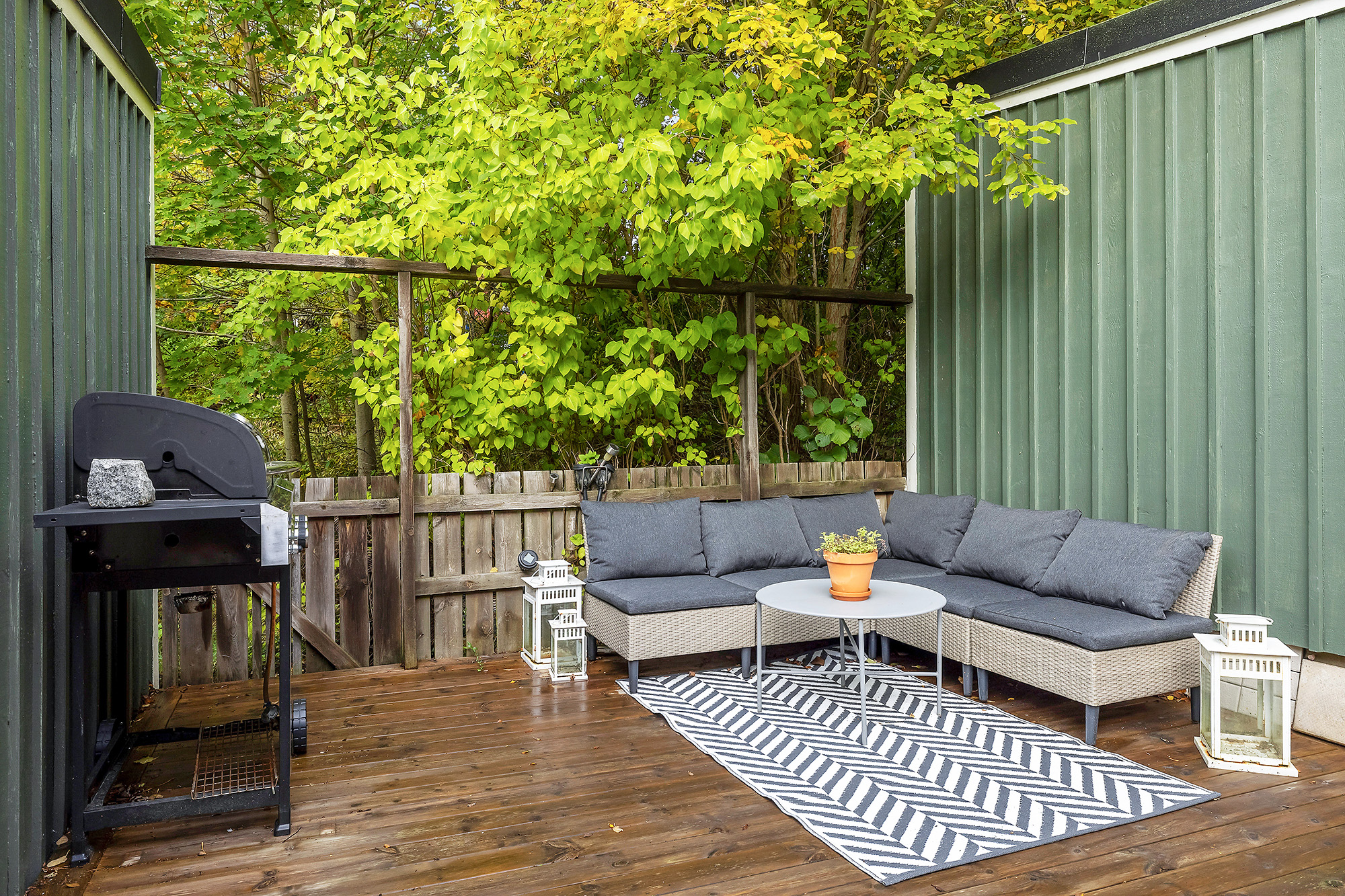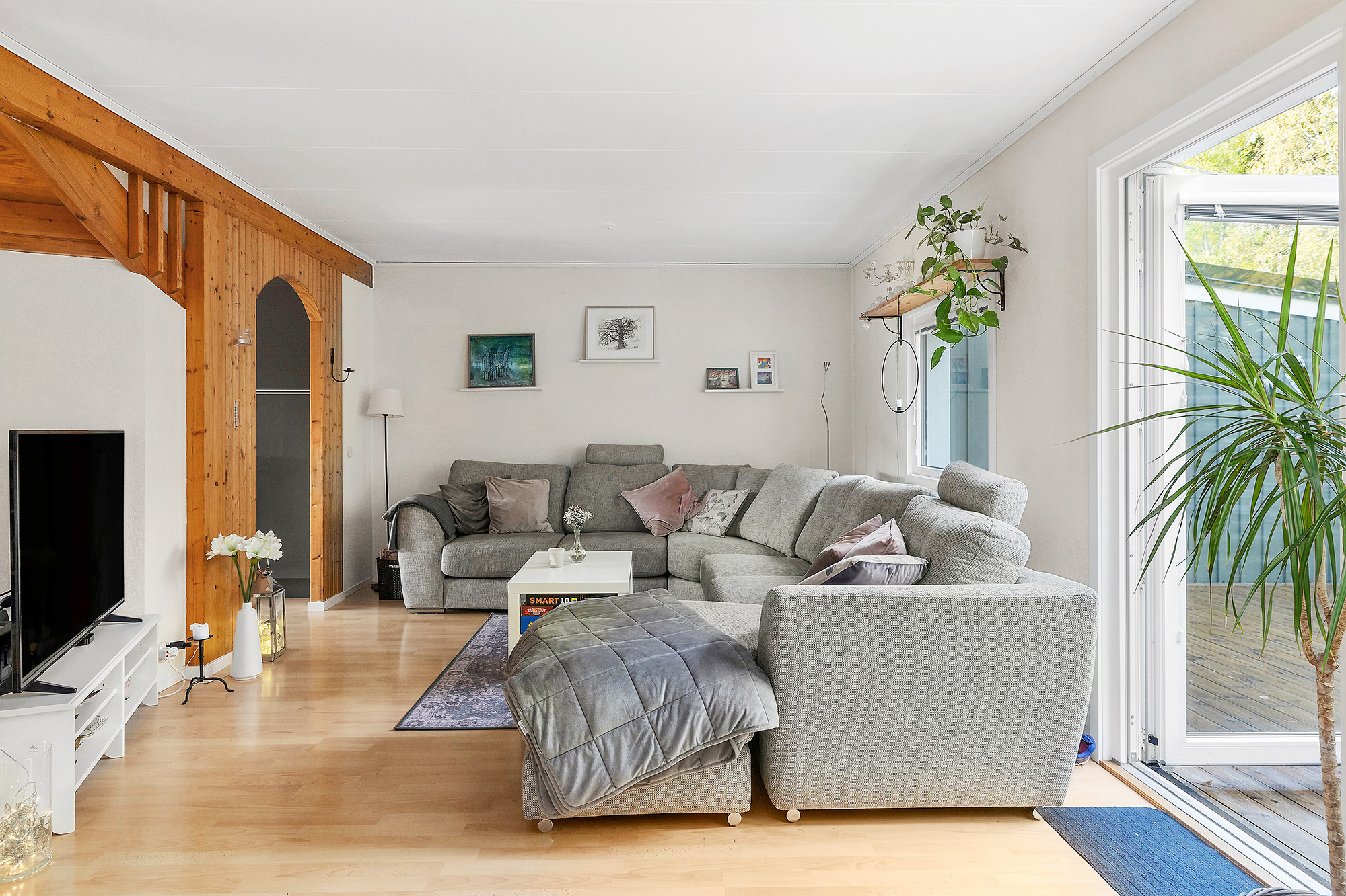 Rymligt vardagsrum som rymmer det mesta som soffgrupp och t.ex. extra matbord. Utgång till altan och uteplats mot allmänning. Trälaminat på golvet och ljusa tapeter på väggarna.