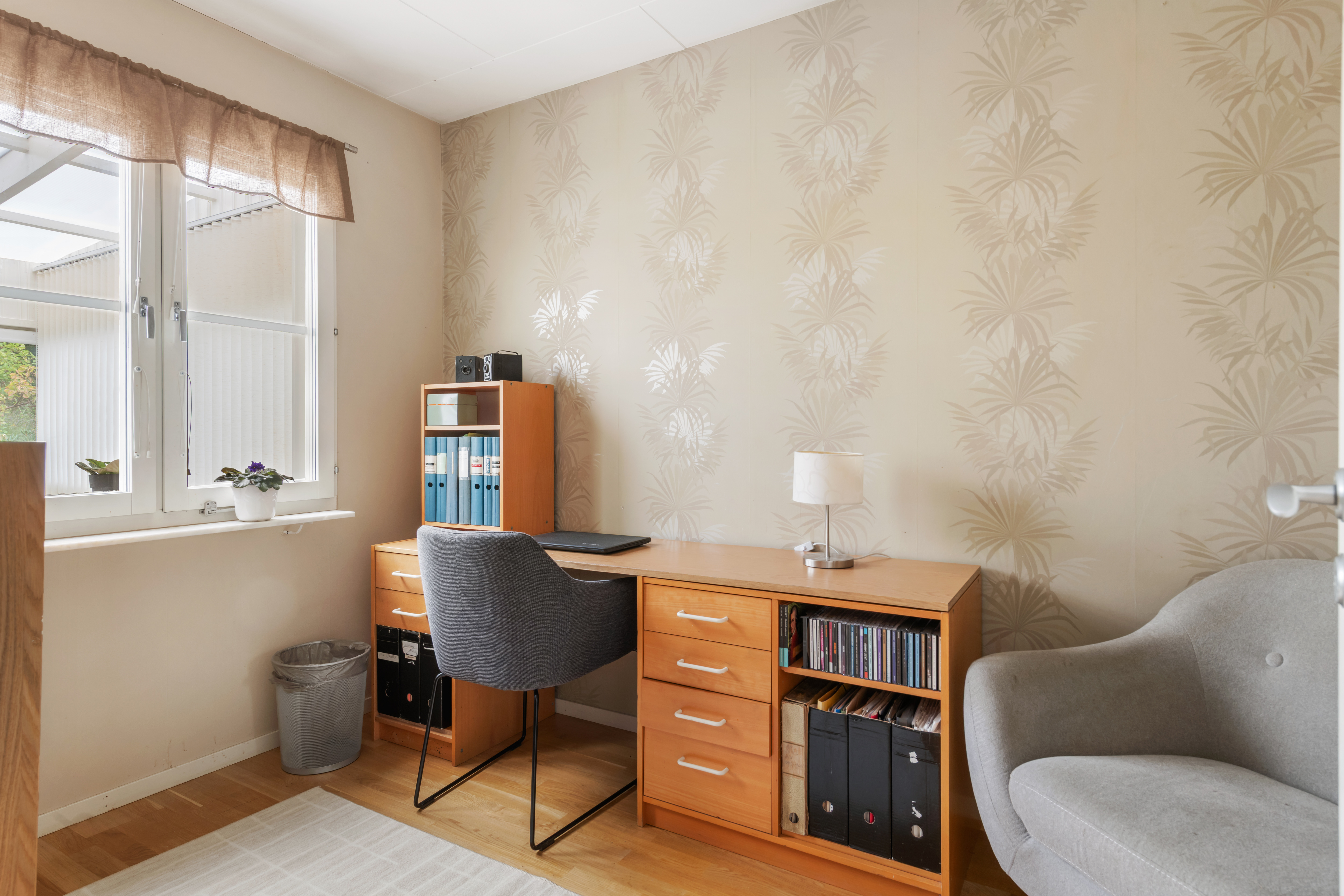 Utrymme med plats för t.ex. kontor eller extra förvaring. Här finns idag två garderober. Två fönster ger extra ljus. Trälaminat på golvet och ljusa tapeter på väggarna.