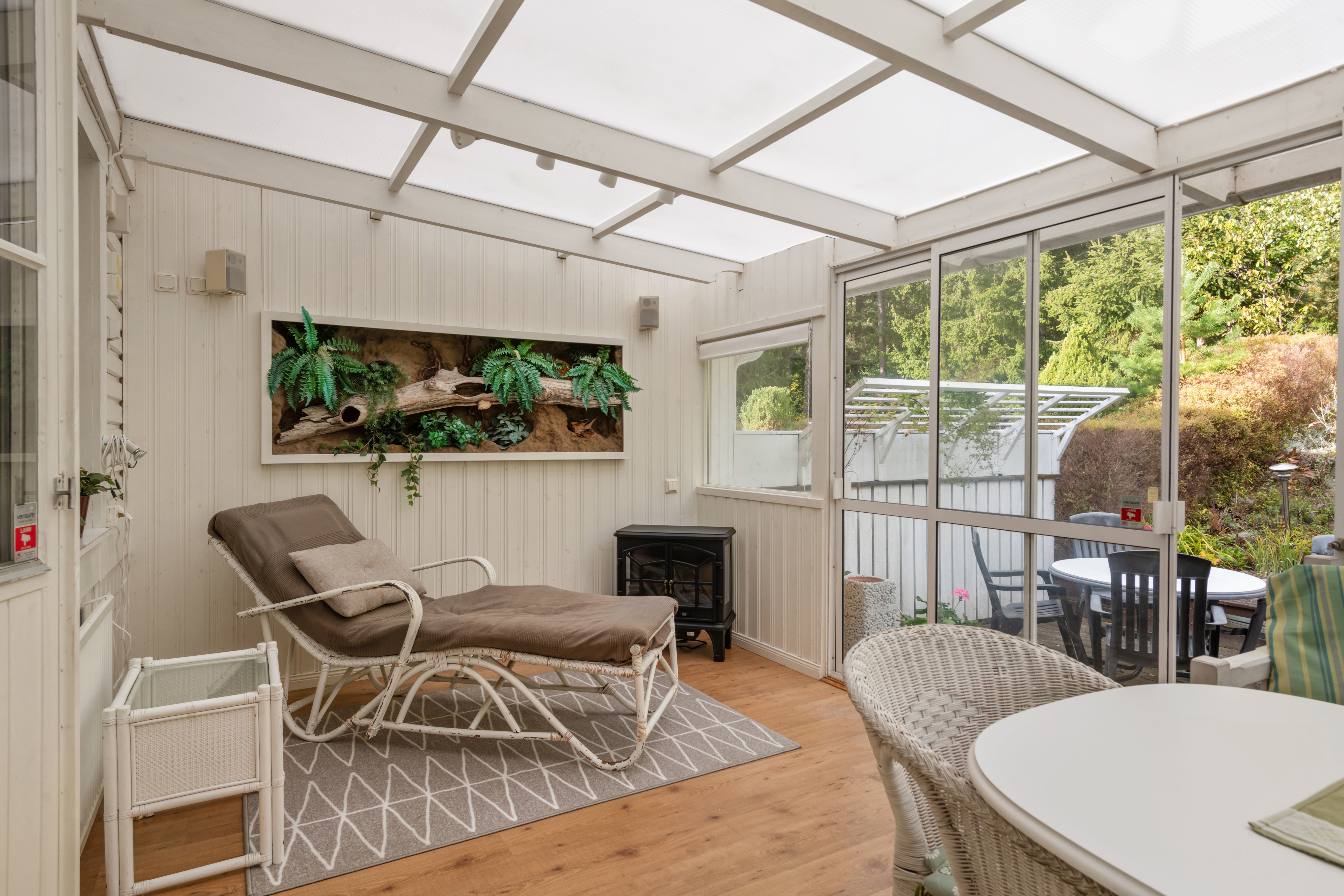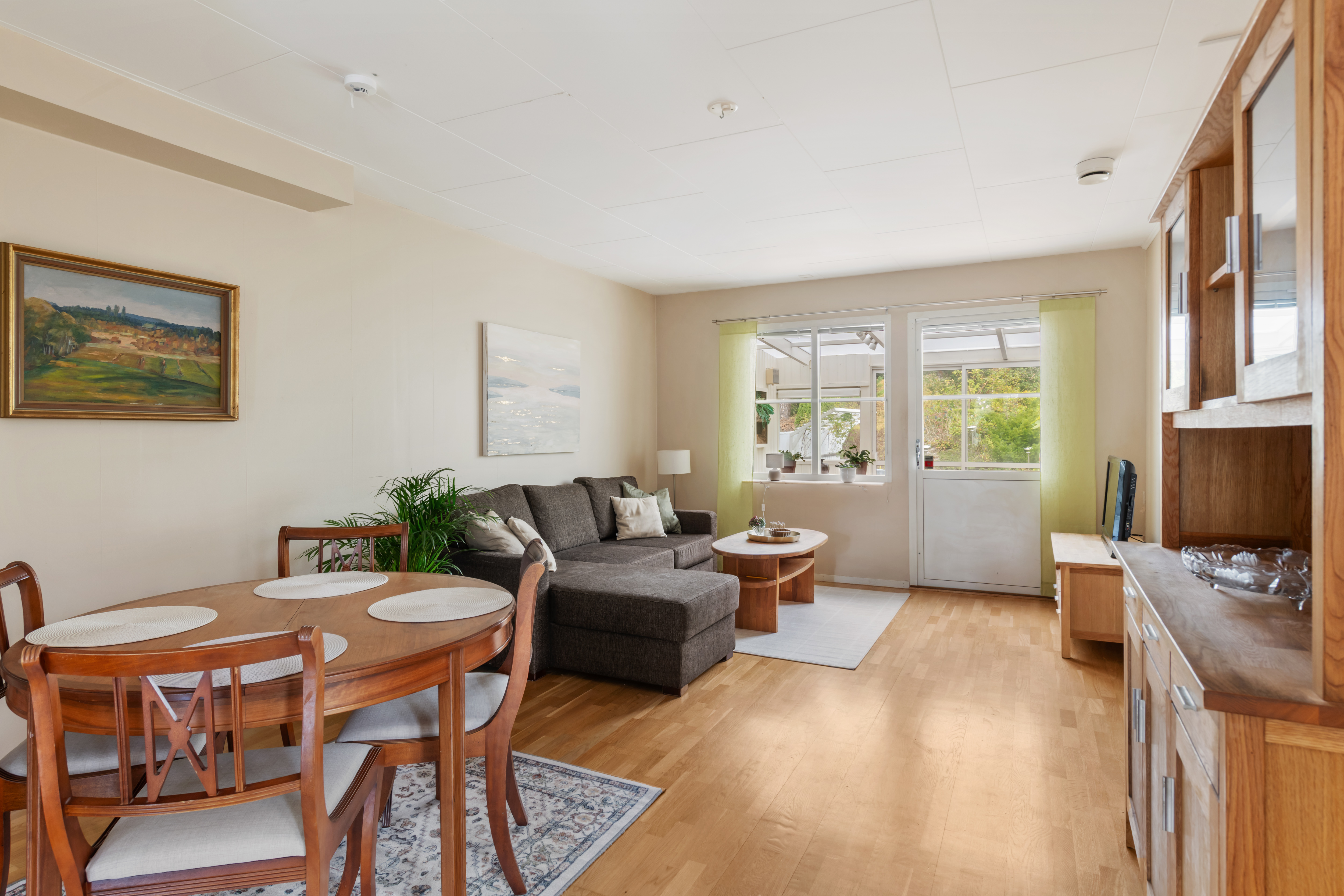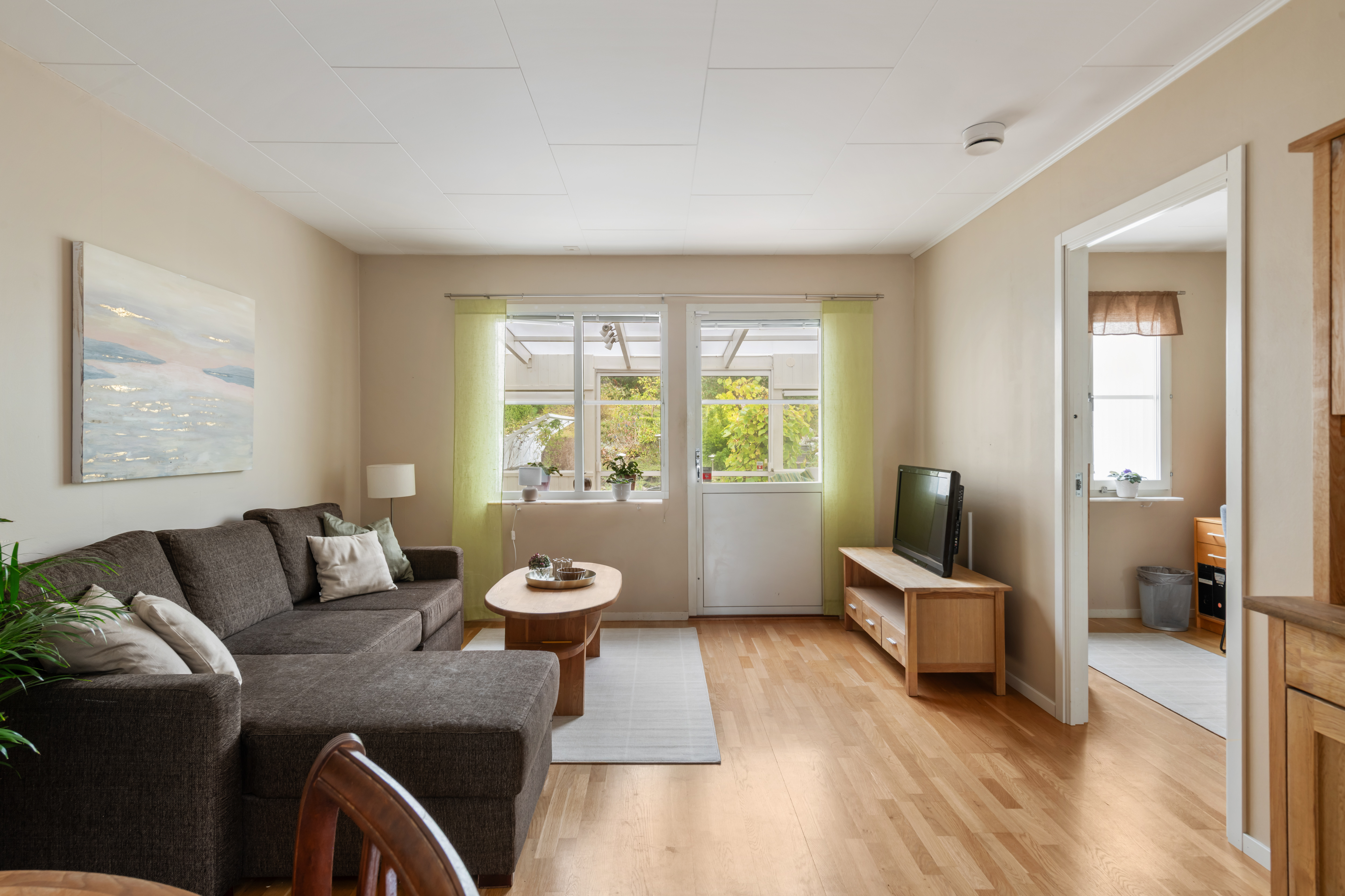 Rymligt vardagsrum som är enkelt att möblera. Trevlig social planlösning med direkt anknytning till både kök och uterum samt uteplatser. Ekparkett på golvet och ljus tapet på väggarna.