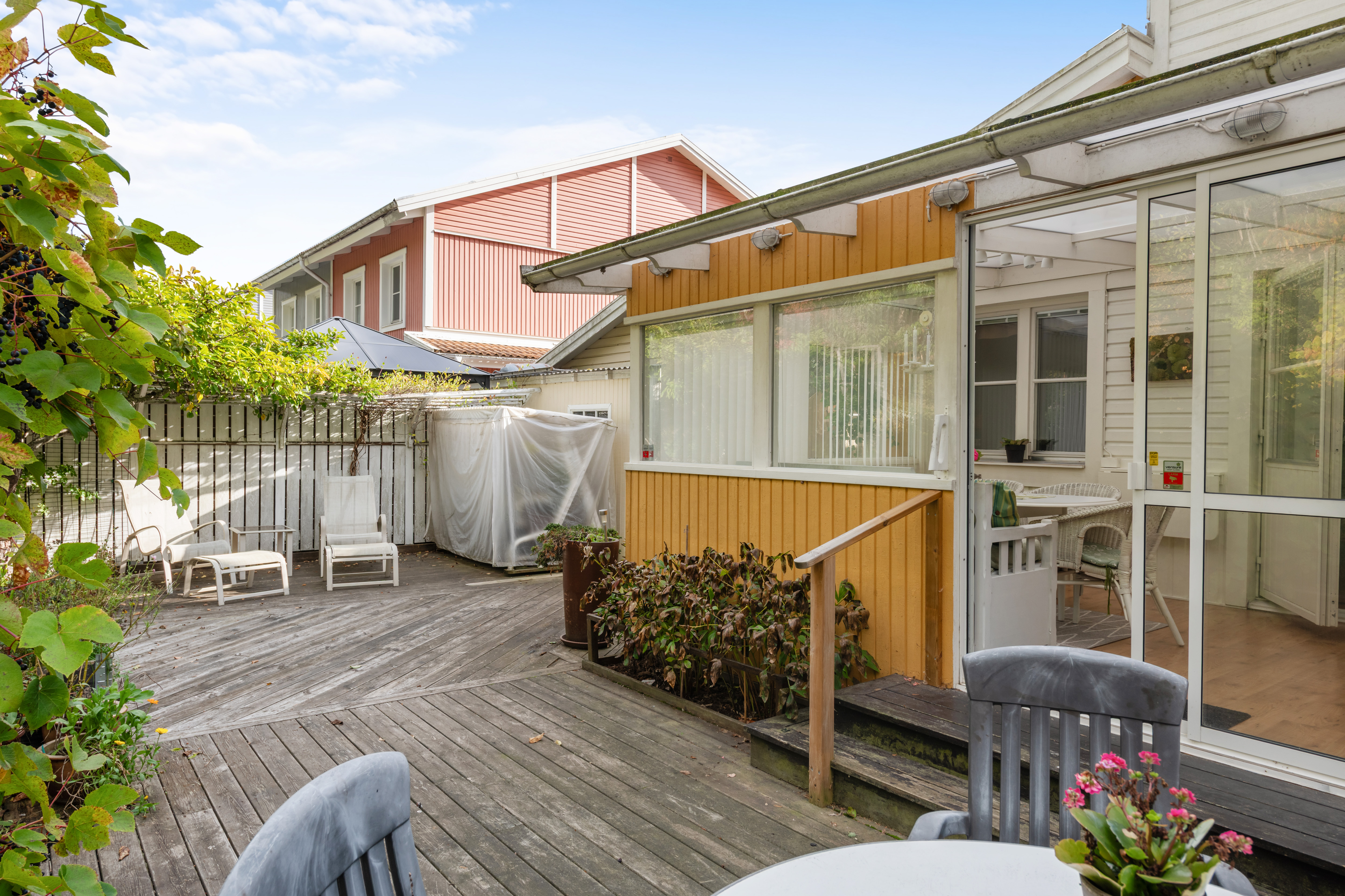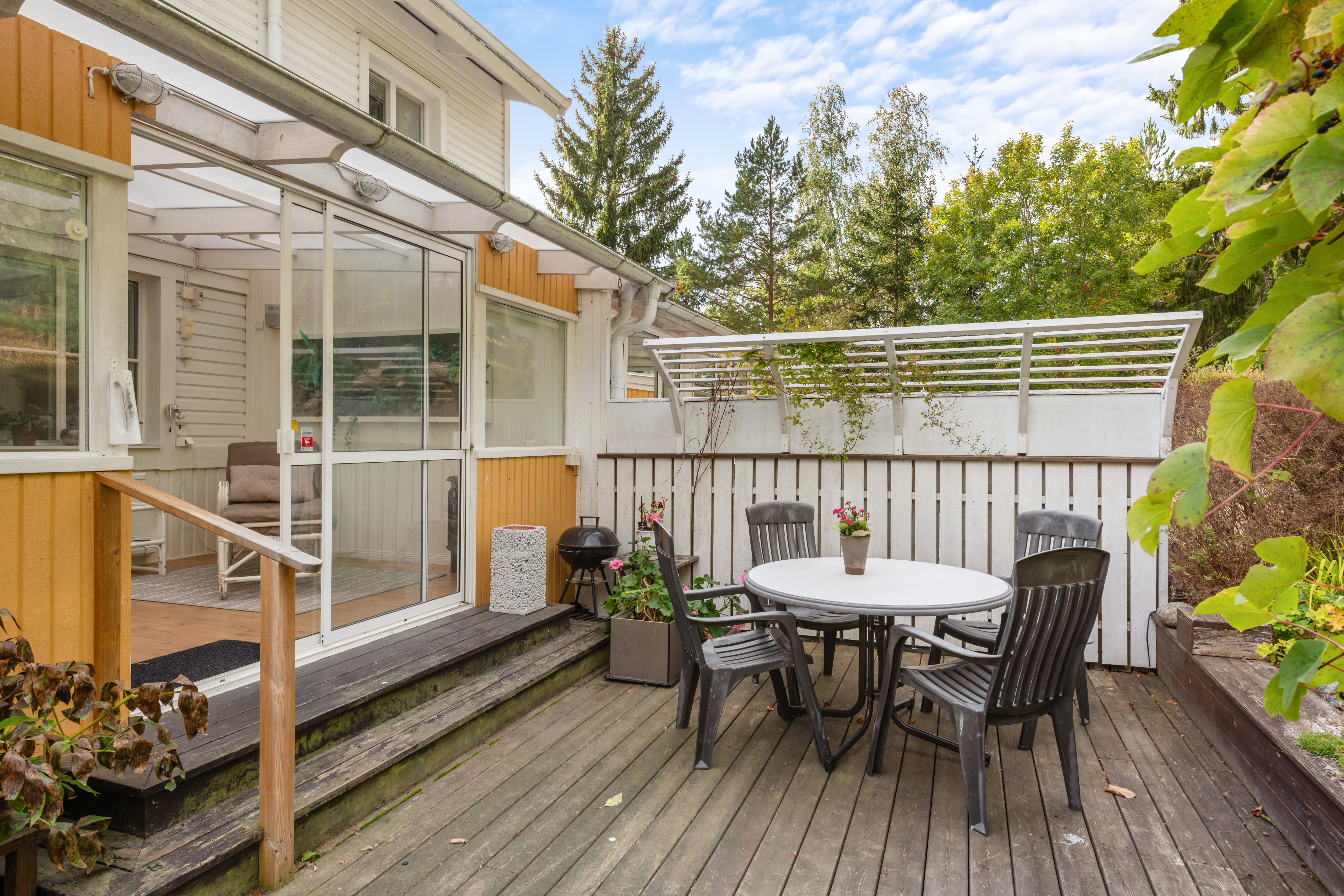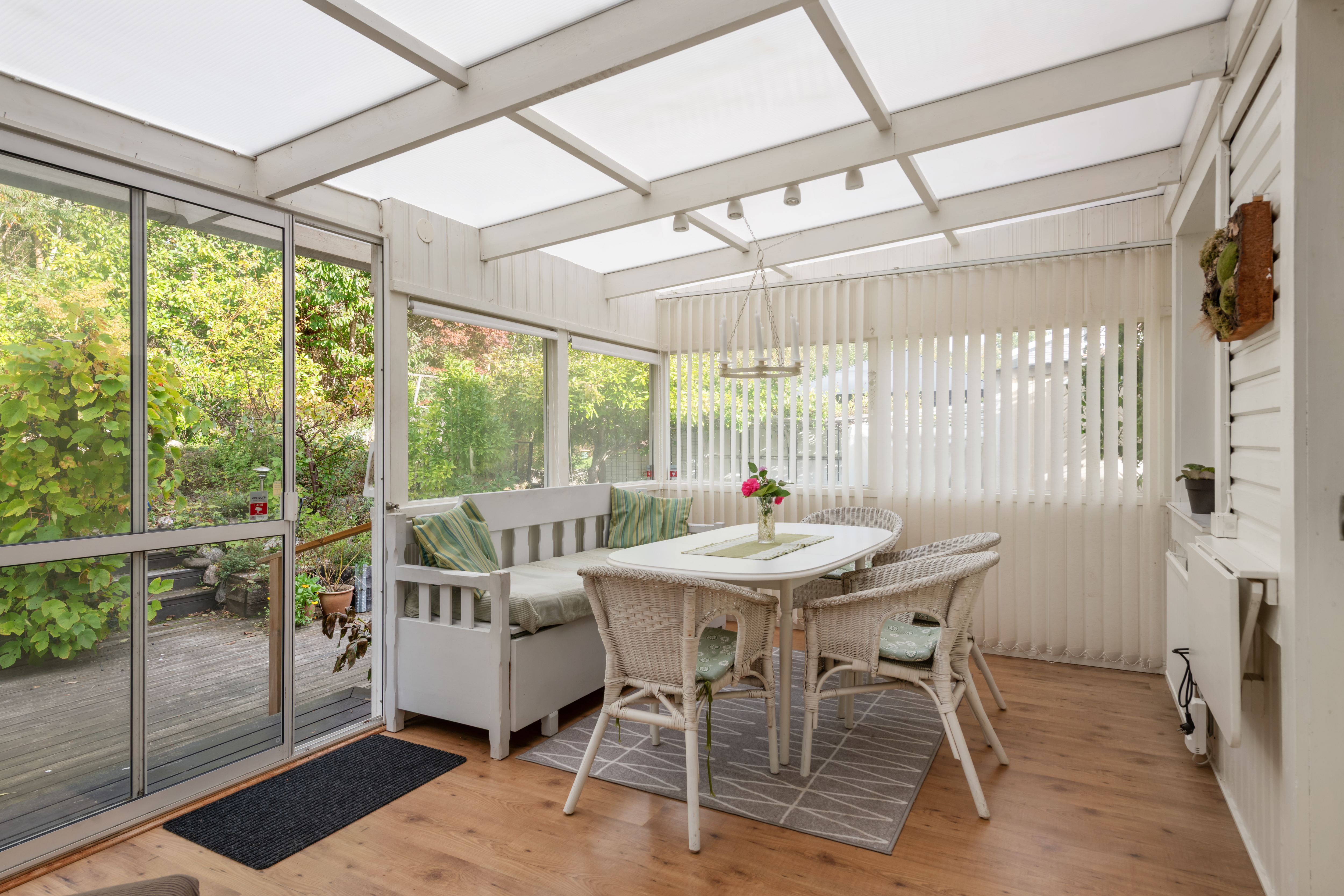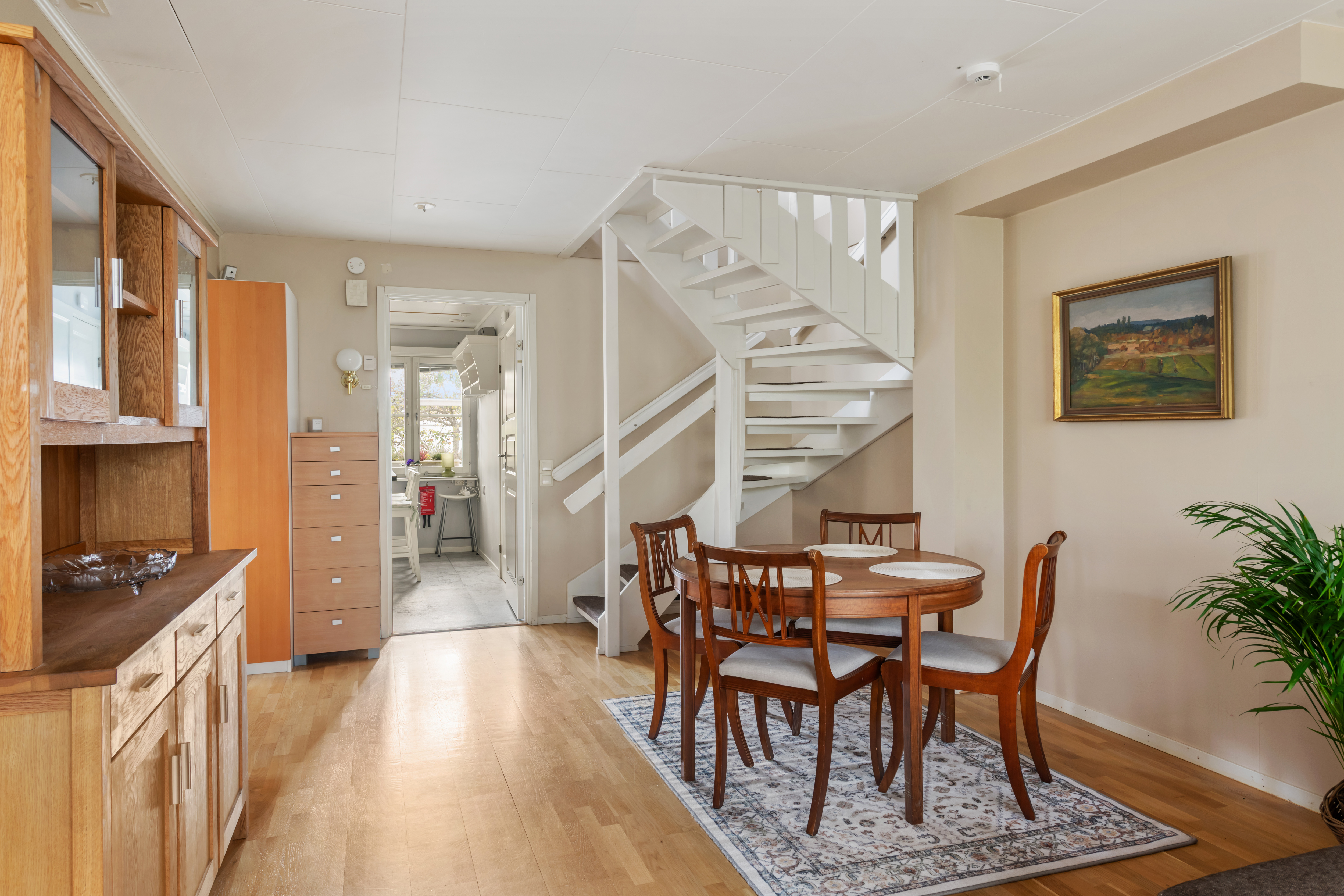Rymligt vardagsrum som är enkelt att möblera. Trevlig social planlösning med direkt anknytning till både kök och uterum samt uteplatser. Ekparkett på golvet och ljus tapet på väggarna.