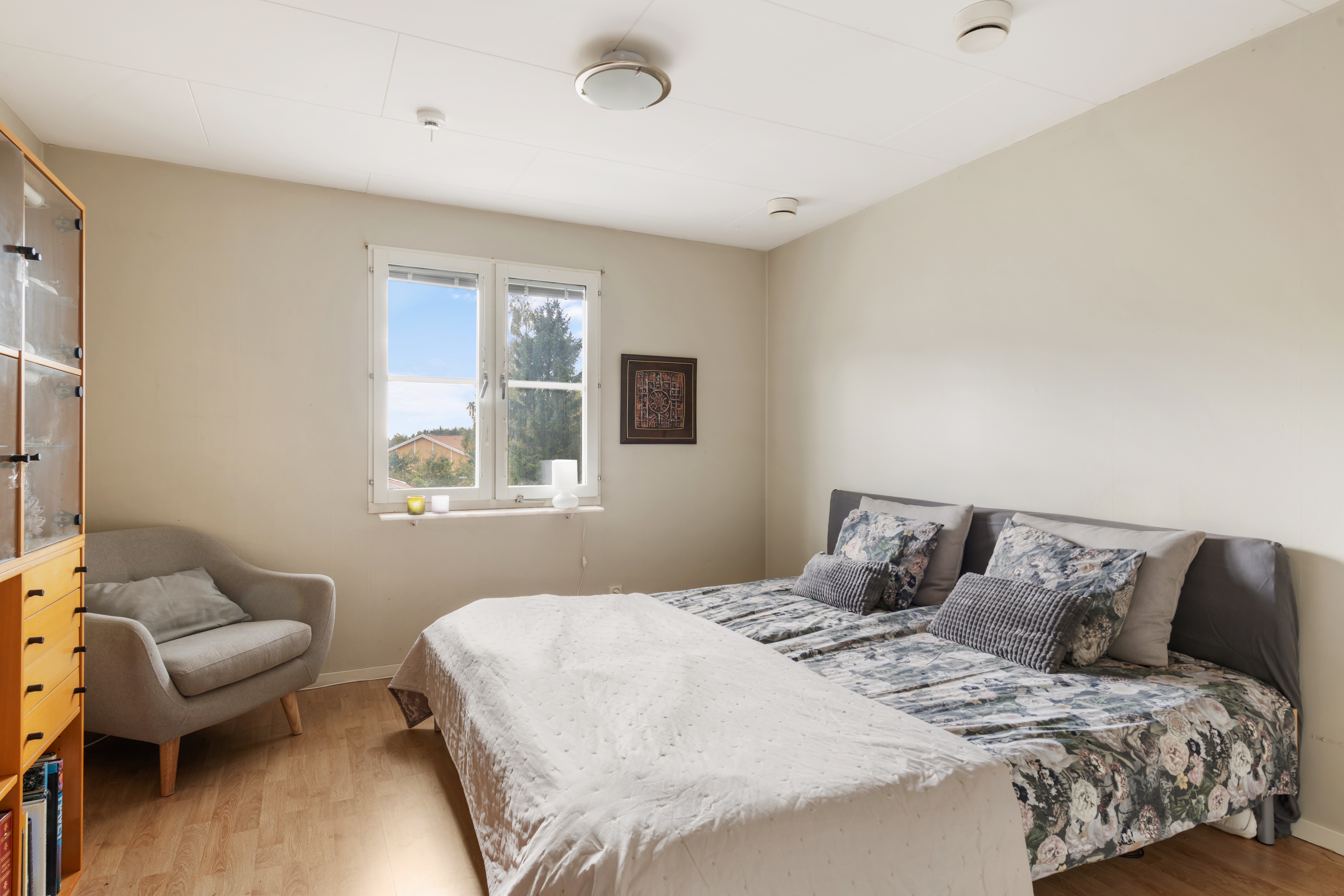 Rymligt sovrum som är enkelt att möblera. Trälaminat på golvet och ljusa tapeter på väggarna.