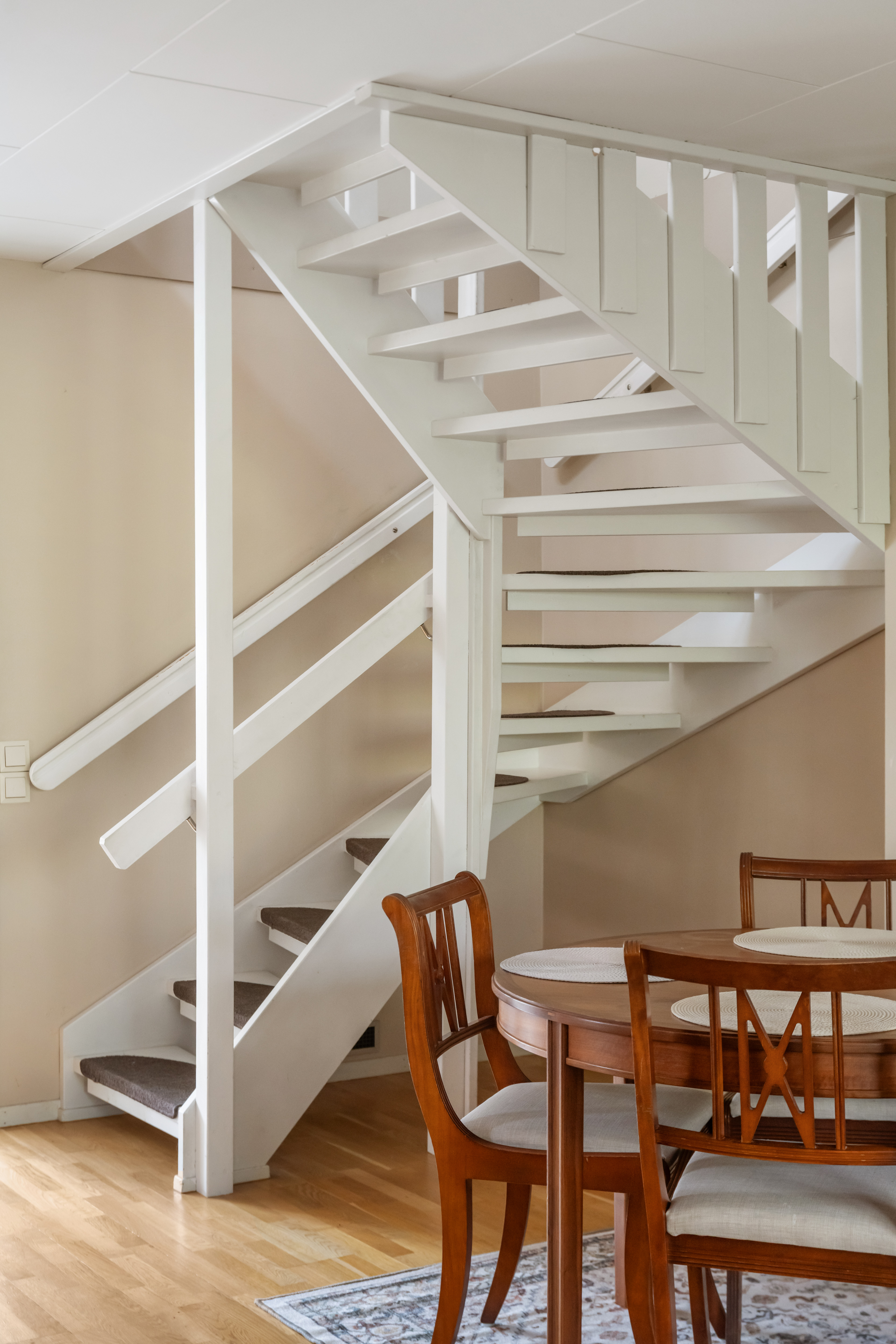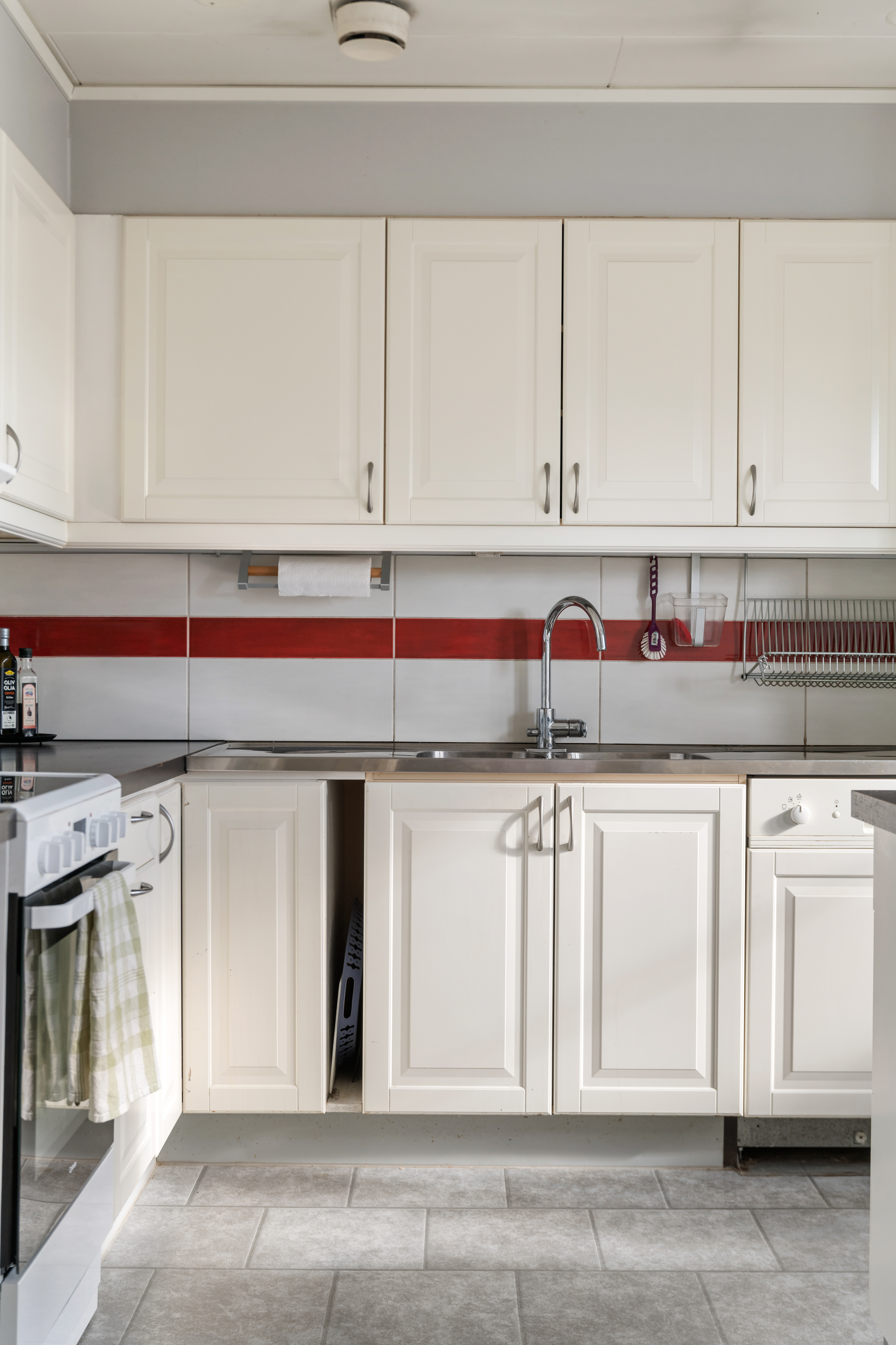 Trivsamt kök med gott om förvaring i flera skåp och lådor, samt i köksö. Köket går i vitt med vitt stänkskydd ovan diskbänk samt laminatgolv. Ljusa tapeter på väggarna och stora fönsterpartier ger extra ljus och rymd. Här finns kyl och frys i fullhöjd, diskmaskin, dubbel diskho, ugn med häll samt spisfläkt. Från köket nås även tvättstugan med groventré till framsidan.