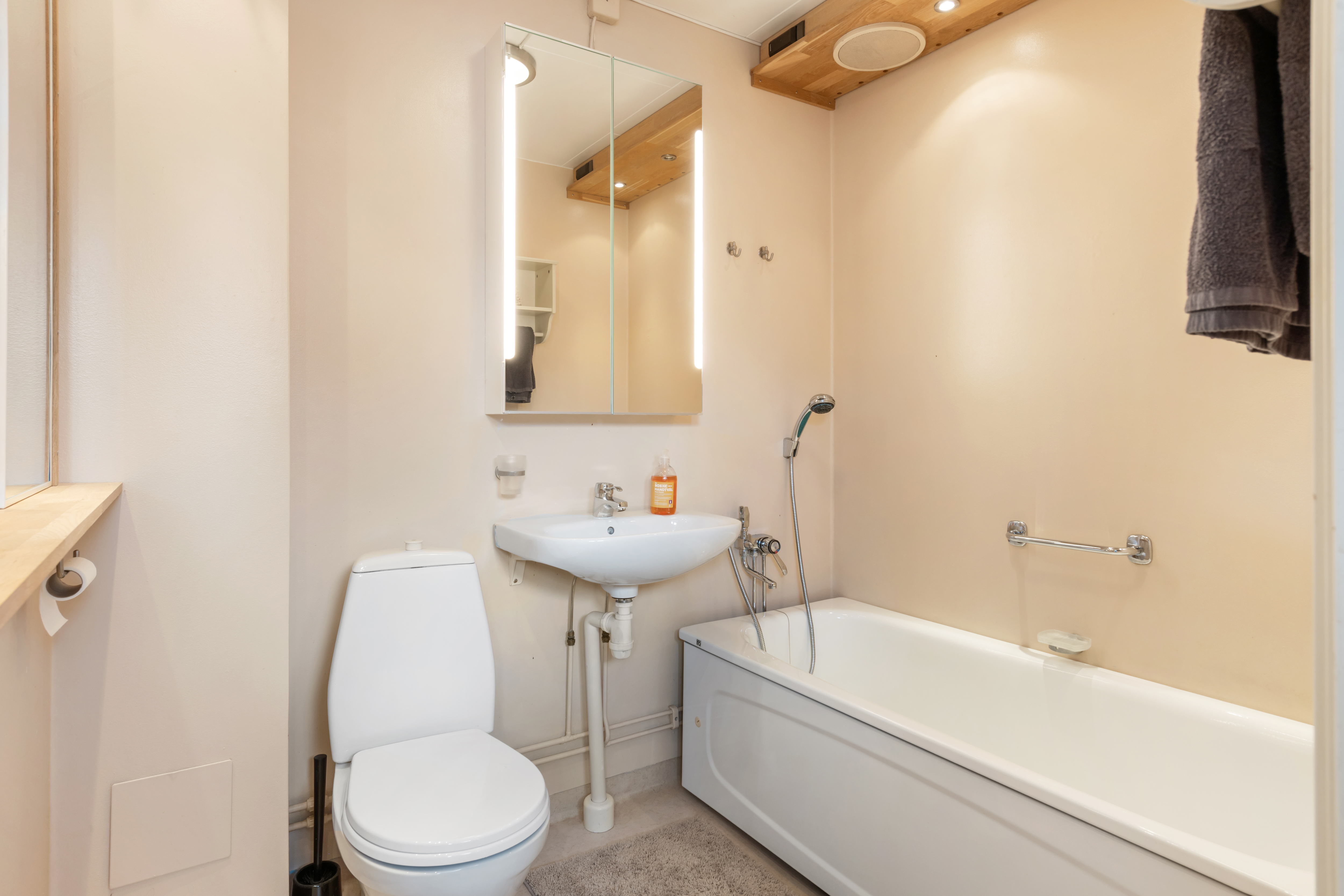 Husets andra badrum. Detta med badkar. Handfat och badrumsskåp med spegelluckor och inbyggd belysning. Våtrumsmatta på golvet och våtrumstapet på väggarna. Golvvärme (funktion okänd).