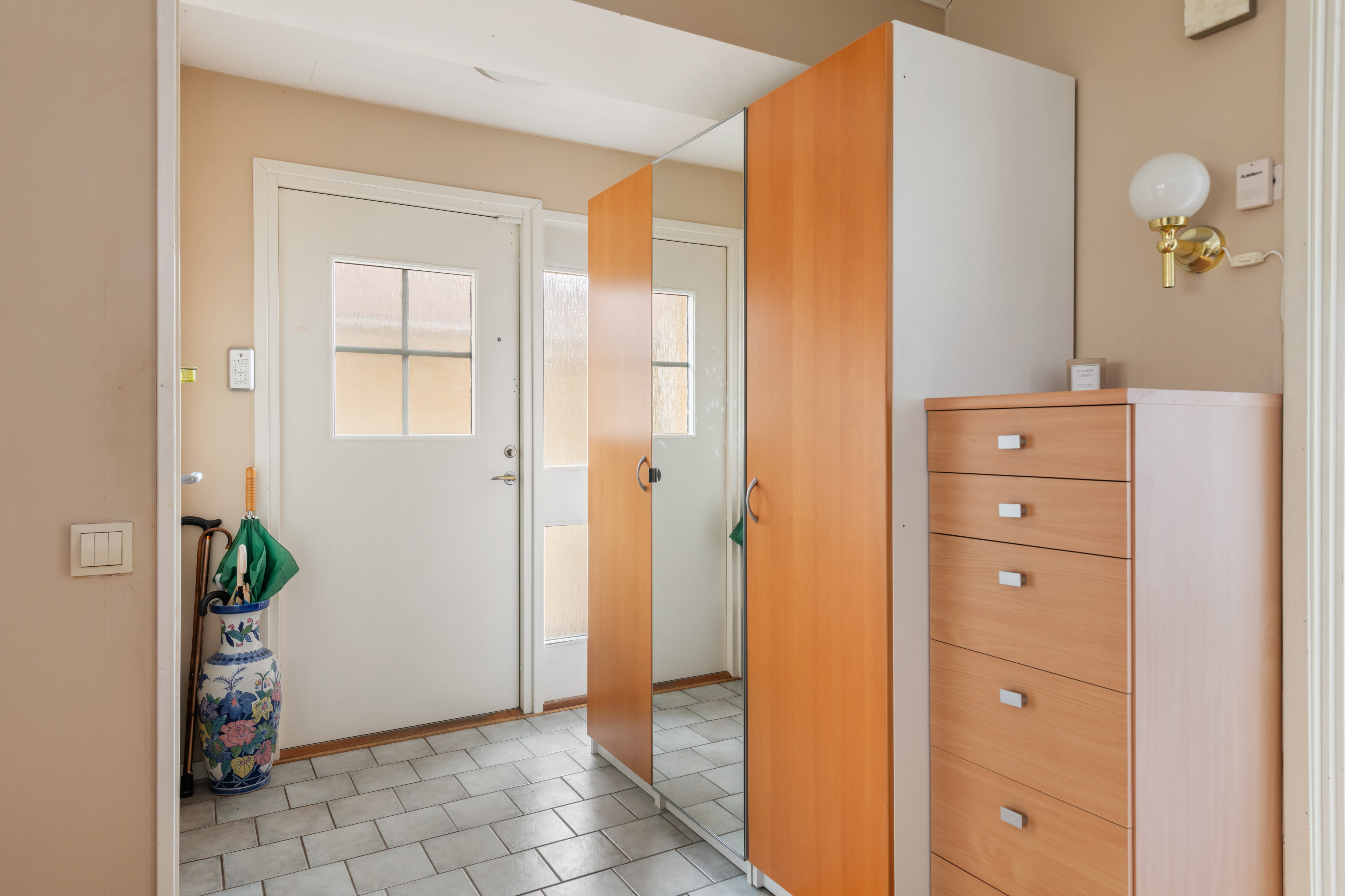 Rymlig hall med gott om plats för förvaring och avhängning. Praktiskt med klinkergolv. Ljus tapet på väggarna.