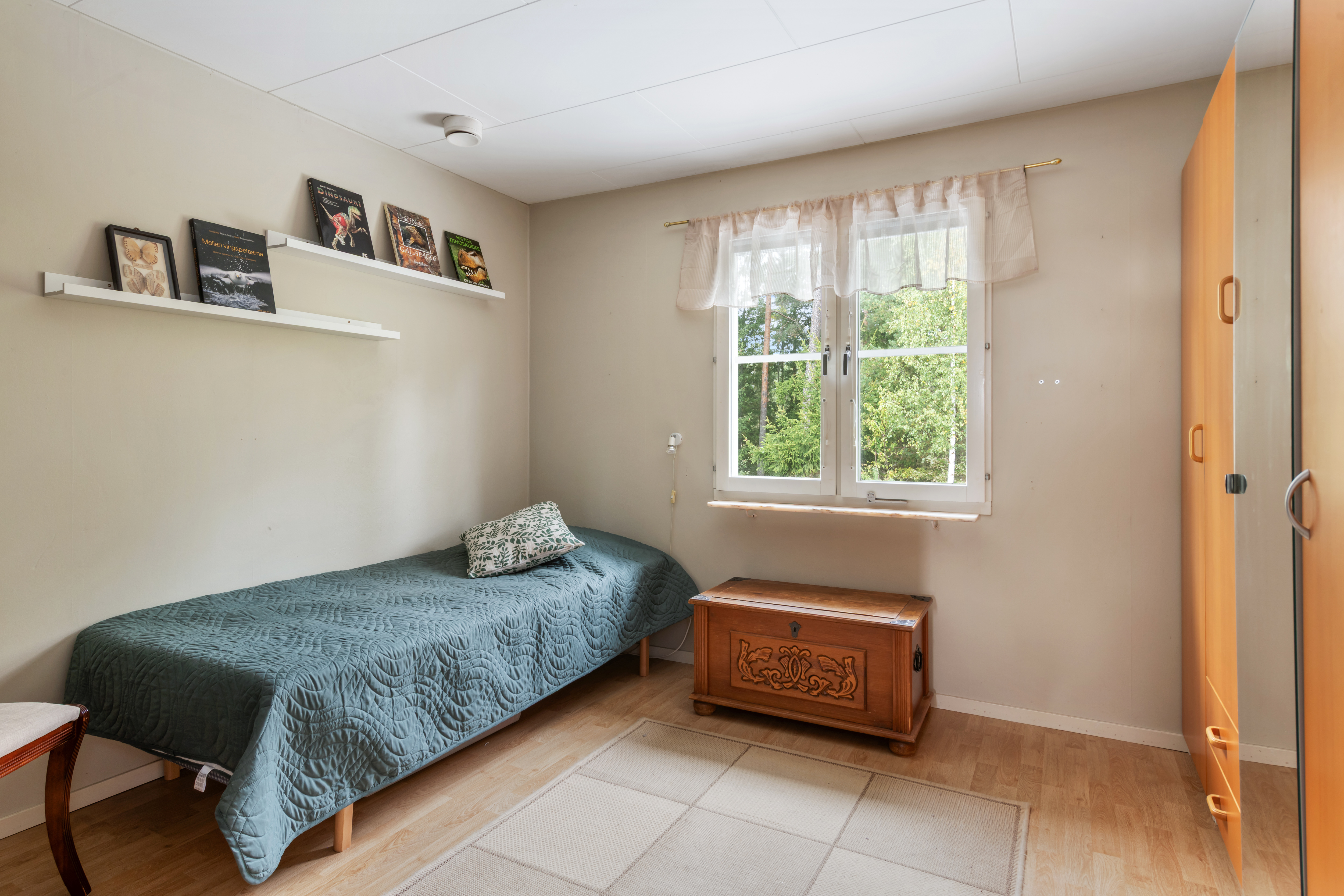 Även detta sovrum är enkelt att möblera. Trälaminat på golvet och ljusa tapeter på väggarna.
