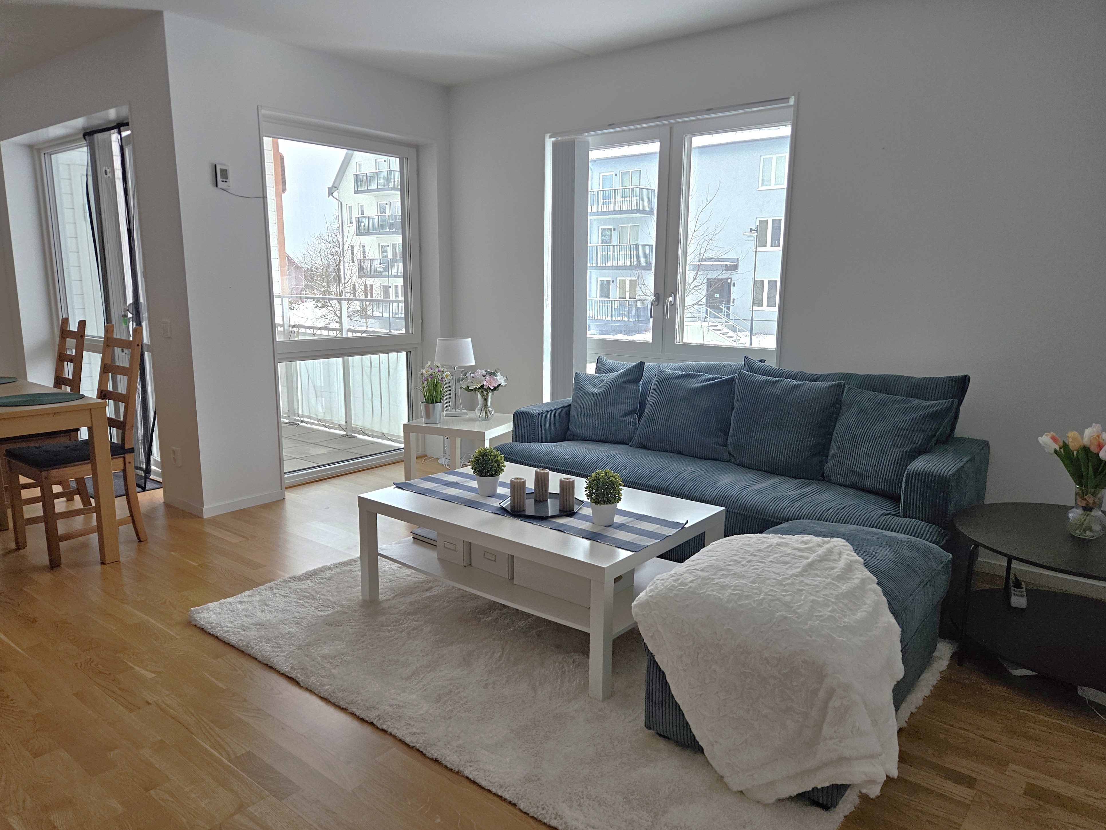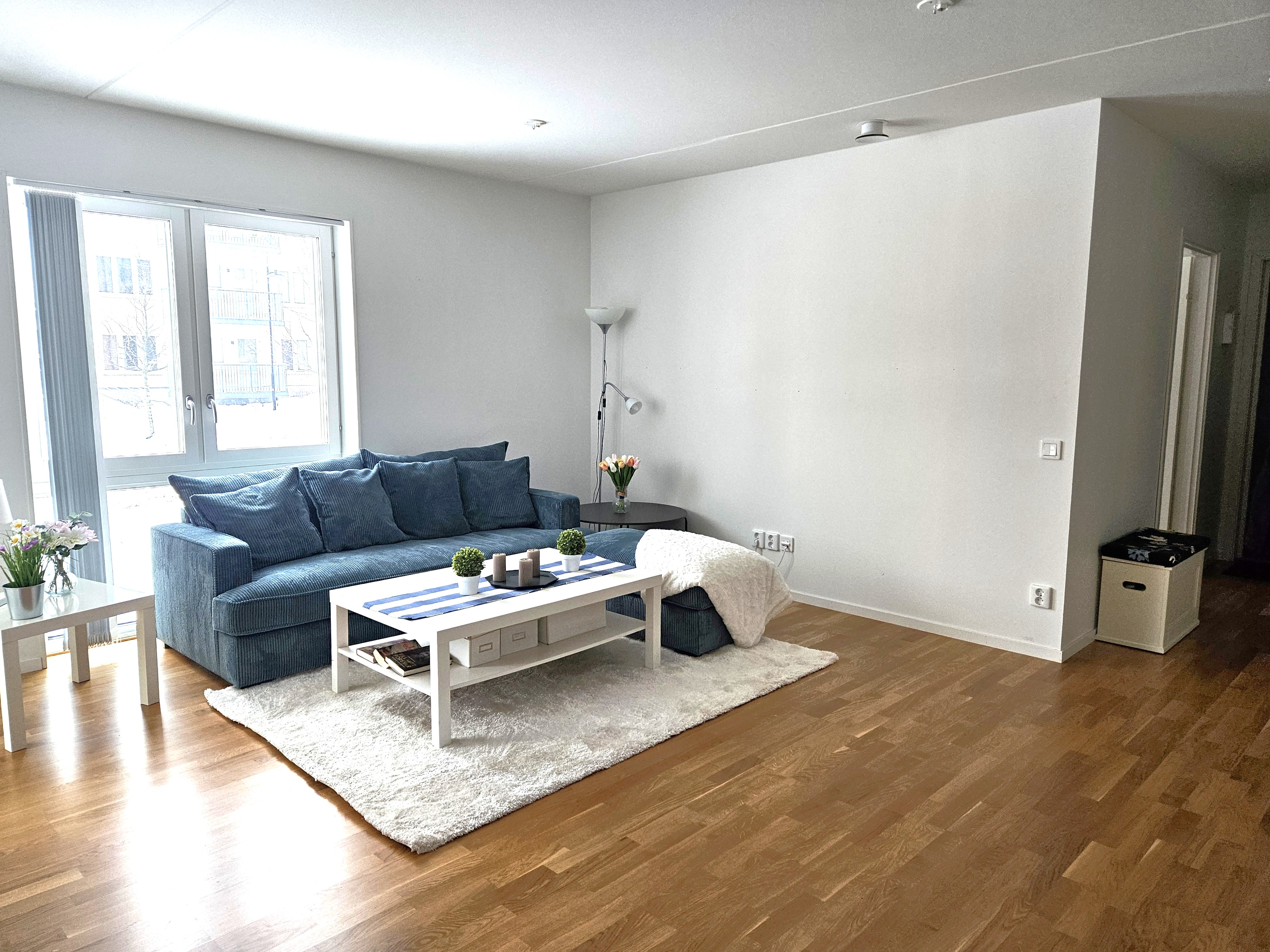 Ljust vardagsrum med trivsam och social planlösning. Här ryms större soffgrupp och övriga möbler. Öppet mot kök och given plats för matbord mellan köket och vardagsrummet, samt utgång till balkongen via köket. Ekparkett på golvet och vitmålade väggar.
